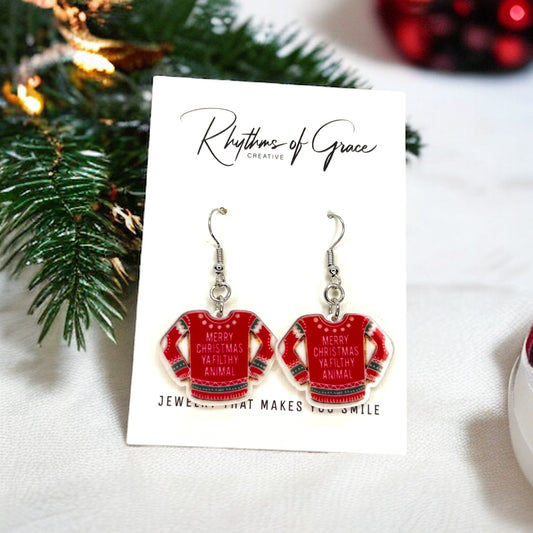 Sass Meets Sweater – “Merry Christmas Ya Filthy Animal” Dangle Earrings