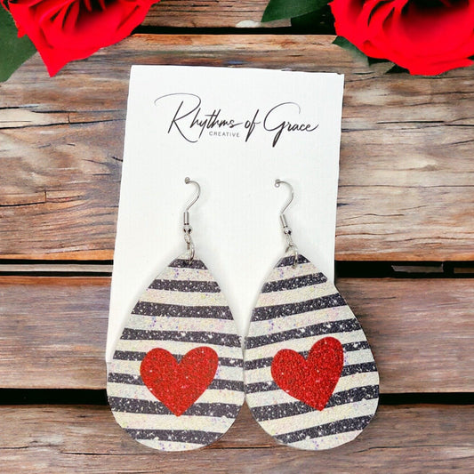 Stripe Me Sweet – Red Heart Teardrop Earrings with Bold Black & White Stripes