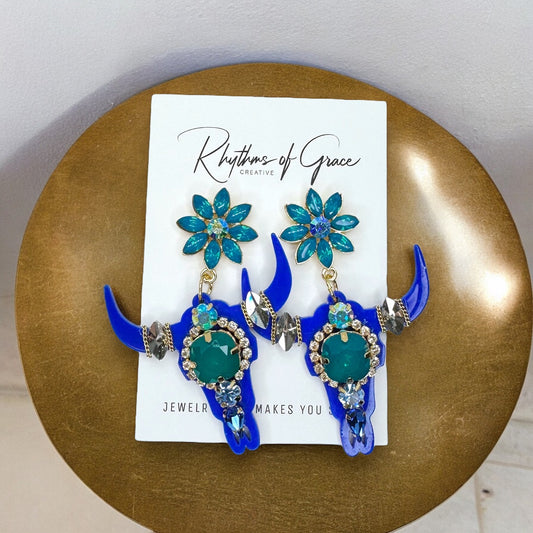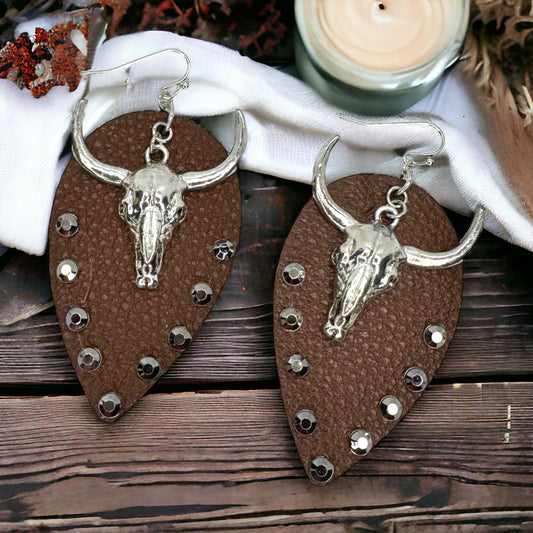 Stunning Western Bull Head Dangle Earrings - Brown Leather, Zinc Alloy, Stainless Steel & Rhinestones