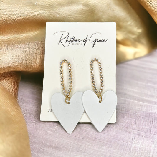 White Heart Earrings - Rhinestone Earrings, White Earrings, Handmade Earrings, Heart Accessories