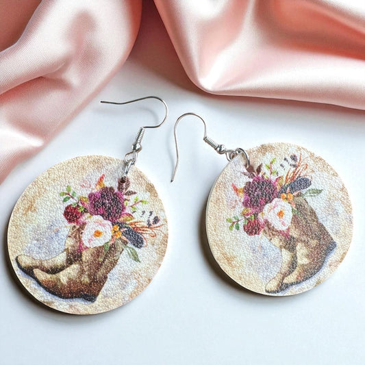 Boots & Blooms: Floral Cowgirl Boot Round Dangle Earrings
