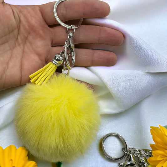 Bright Yellow Pompom Key Chain - 4” Fluffy Keyring Accessory