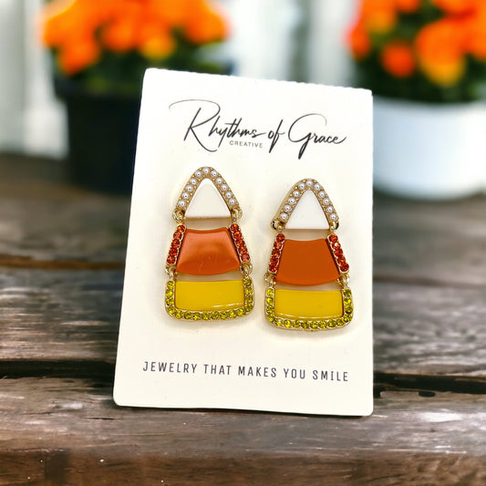 Candy Corn Charm: Rhinestone Earrings for a Sweet Halloween Twist