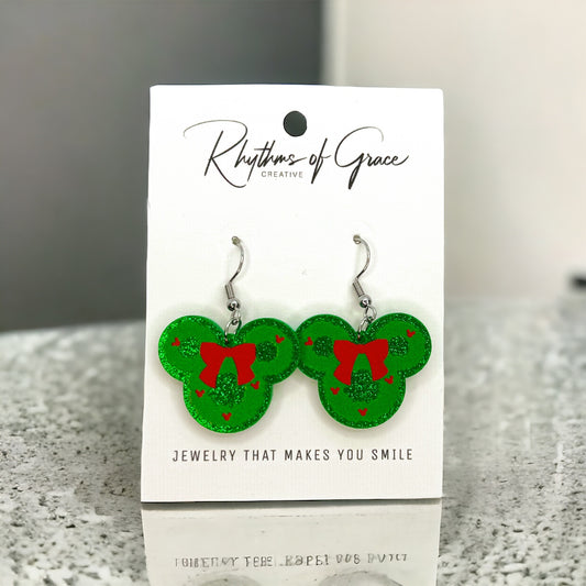 Christmas Mouse Earrings - Festive Mouse Ears, Red & Green Wreath Accessories