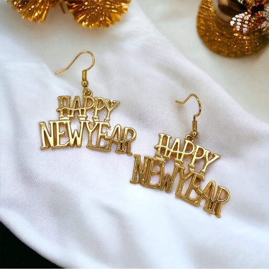 Gold Dangle Happy New Year Dangle Earrings - Celebrate in Style!