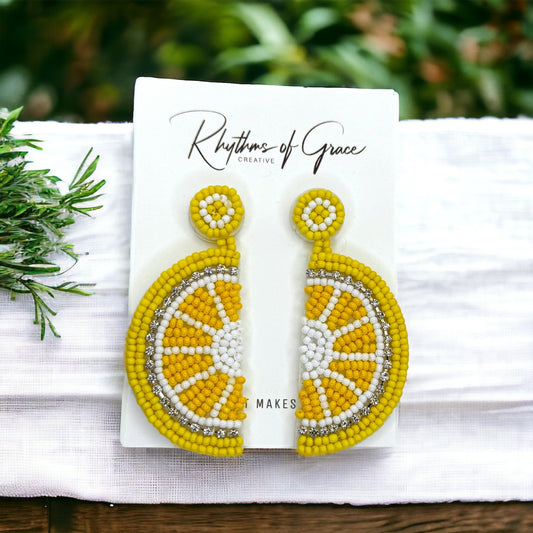 Beaded Lemon Earrings - Fruit Earrings, Handmade Jewelry, Lemon Jewelry, Food Earrings, Lemonade