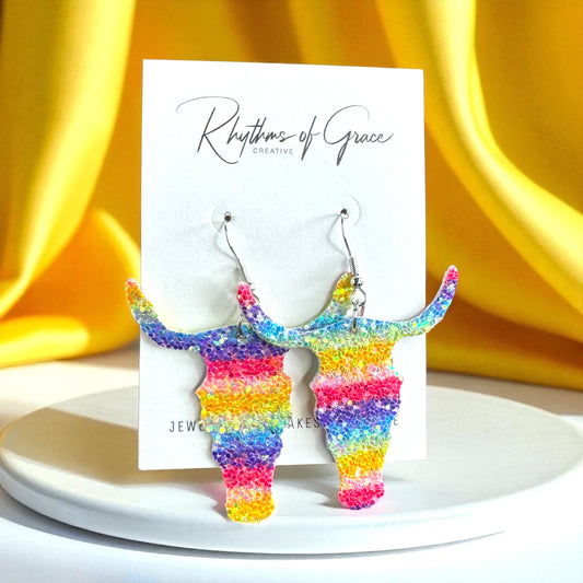 Longhorn Dangle Earrings - Sparkle with Rainbow Glitter!