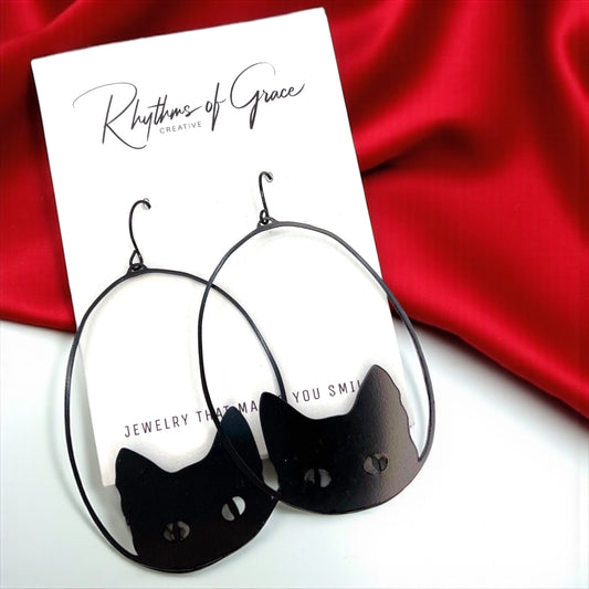 Oversized Black Metal Cat Dangle Earrings - Embrace Your Inner Feline!