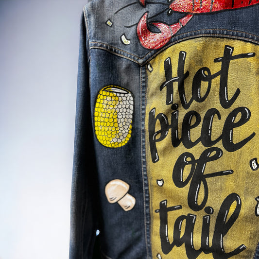 Hand Painted Jean Jacket: “Hot Piece of Tail” - Cajun Jacket, Crawfish, Mardi Gras, Mardi Gras Jacket, New Orleans, Purple Green Gold, Mardi Gras, Parade Outfit