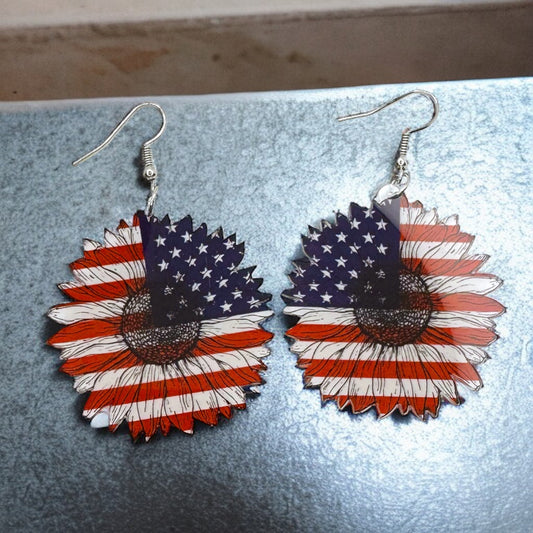 Patriotic Flower Dangle Earrings - Stars & Stripes Design