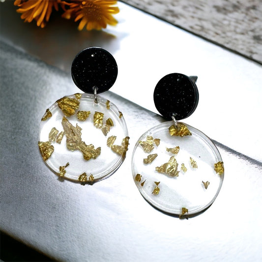 Elegant Gold and Black Acrylic Earrings with Gold Leaf Flecks - Stainless Steel Posts