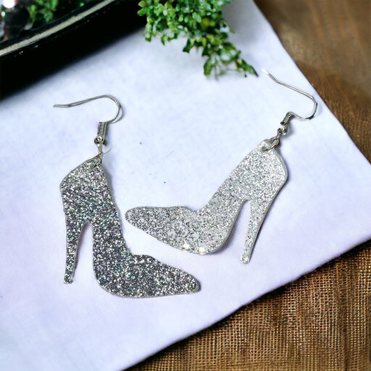 Strut in Style: Dazzling Silver Glitter High Heel Dangle Earrings!