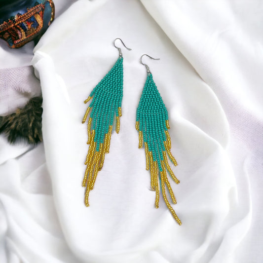 Boho Bliss: Dazzling Blue, Green & Gold Beaded Dangle Earrings