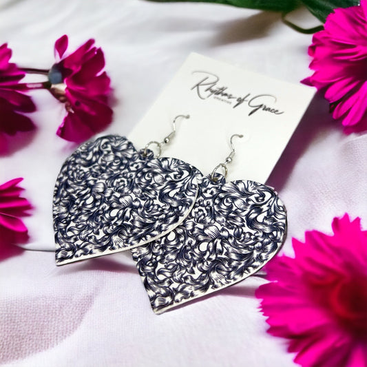 Black and White Heart Earrings - Black and White Earrings, Handmade Earrings, Black Paisley