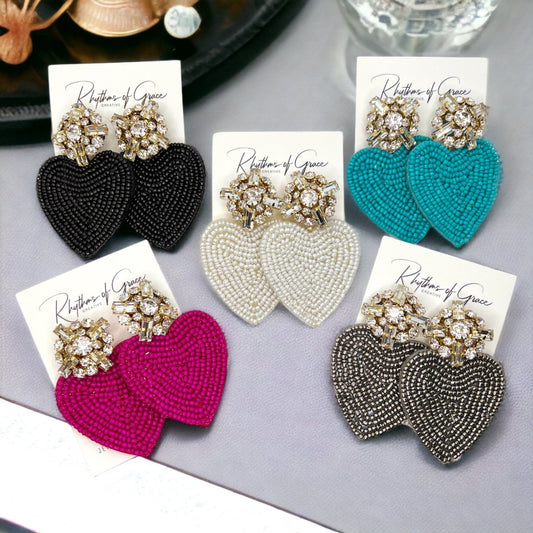 Beaded Heart Earrings - Rhinestone Earrings, Boho Earrings, Bohemian Style, Kentucky Derby, Rose Earrings, Handmade Jewelry, Anniversary