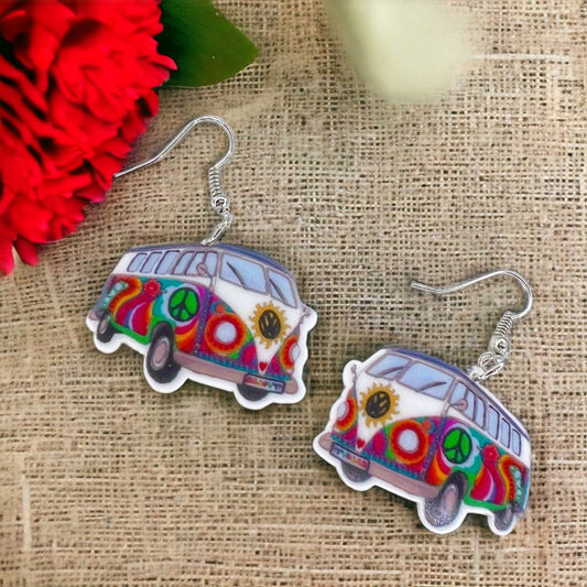 Hippie Van Earrings - Van Accessories, Roadtrip Earrings, Travel Accessories, Flower Power