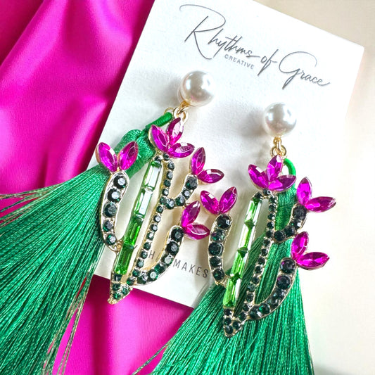 Sparkle in the Desert – Rhinestone Cactus Tassel Earrings 🌵