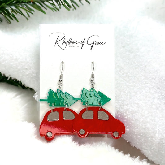 Haulin’ Holiday Cheer Earrings – Red Car with Tree Dangles!🎄