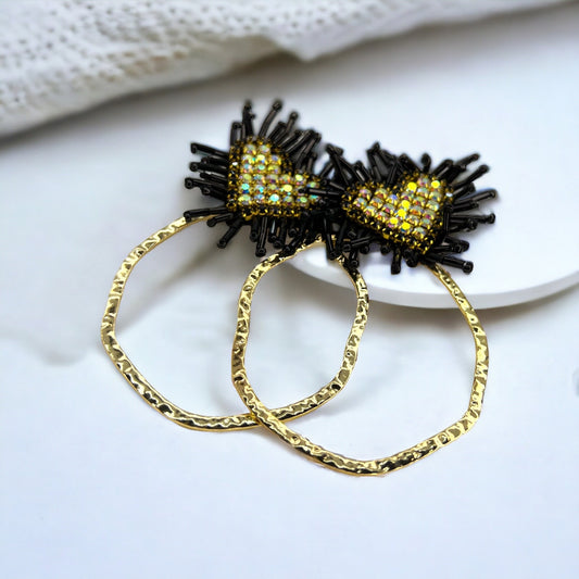 Heartfelt Glam: Pink, Black & Gold Beaded Heart Earrings for Love & Style!