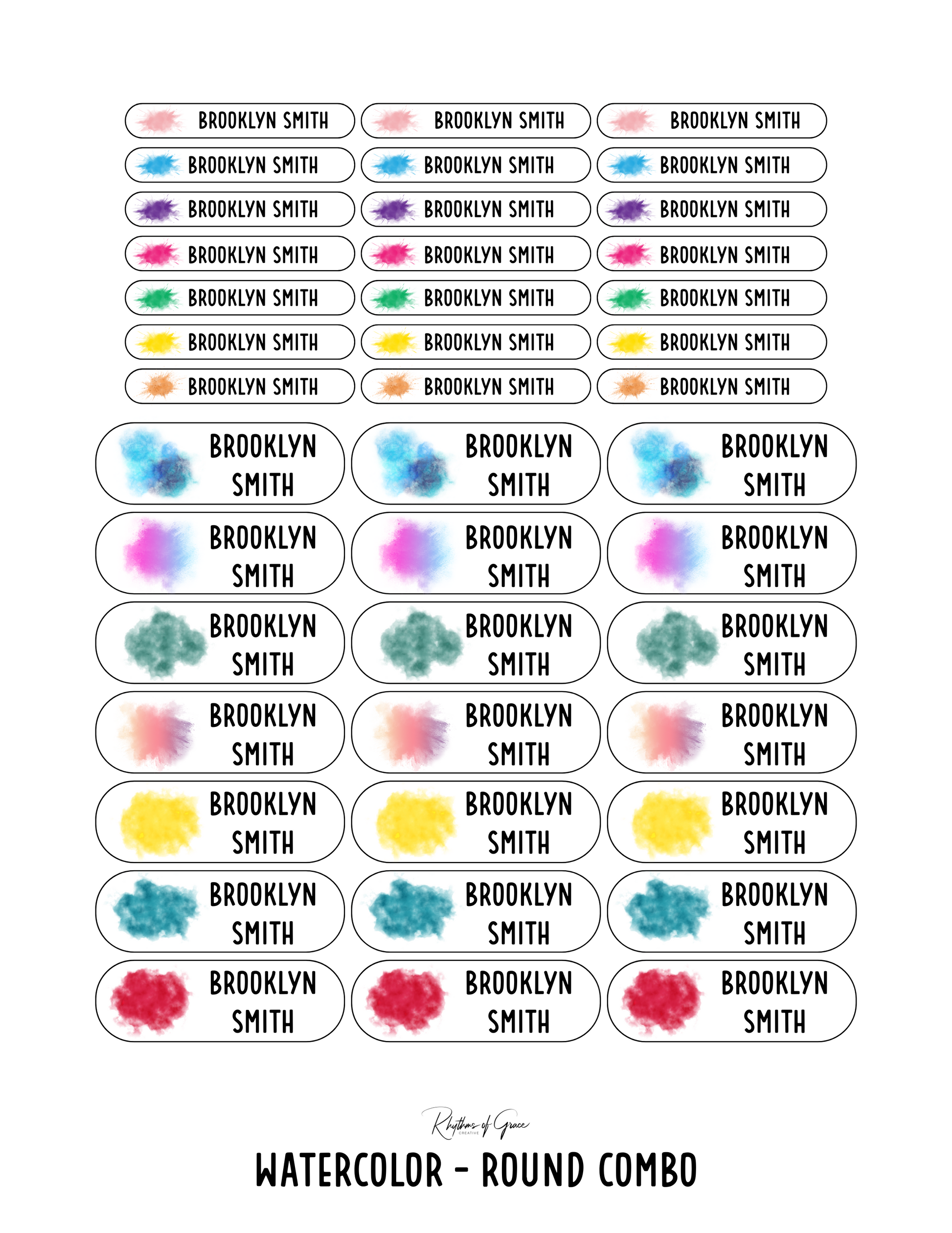 Watercolor / Rounded Edges / Small Combo: Includes 21 small rounded labels (2.1" x .4") and 21 medium rounded labels (2.2" x .7") - 1 sheet