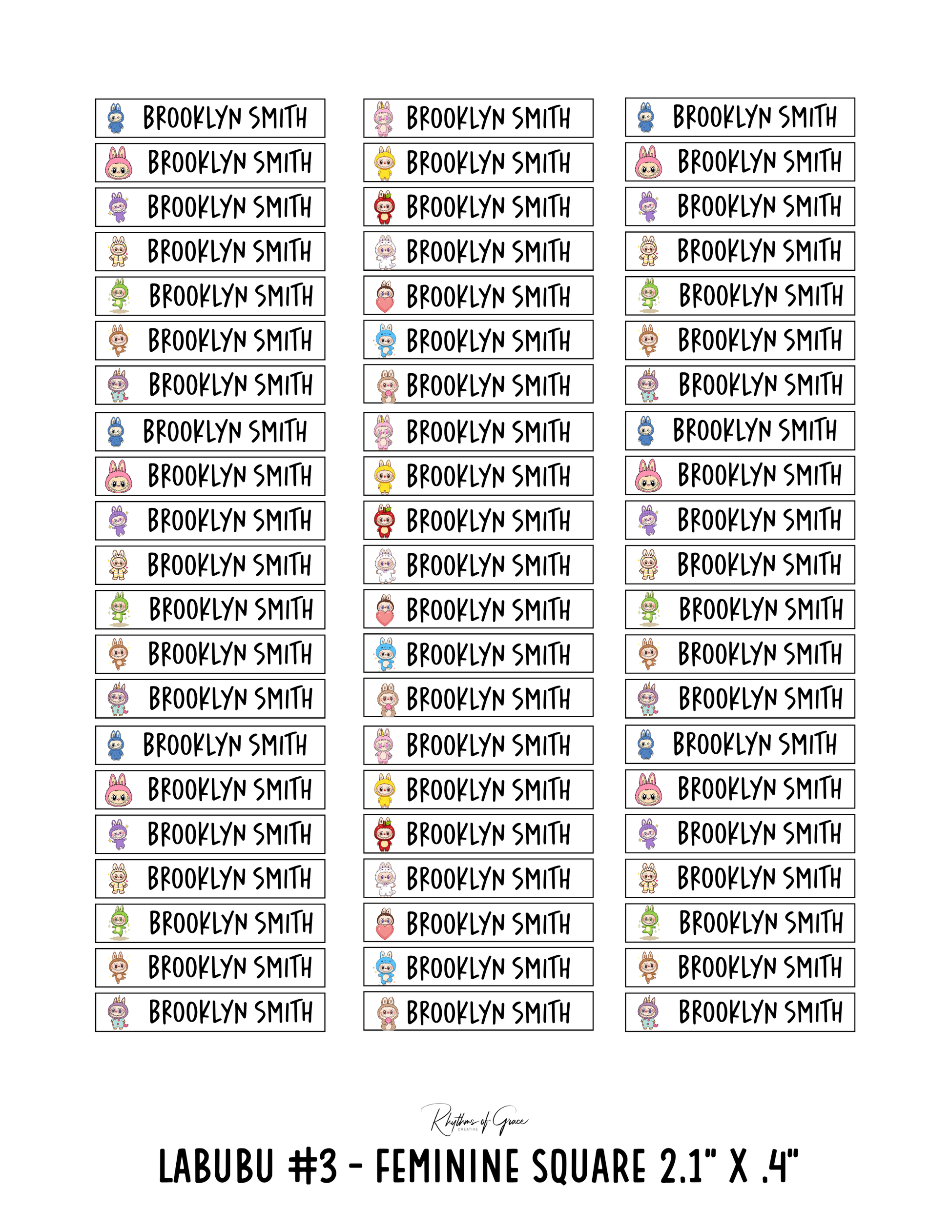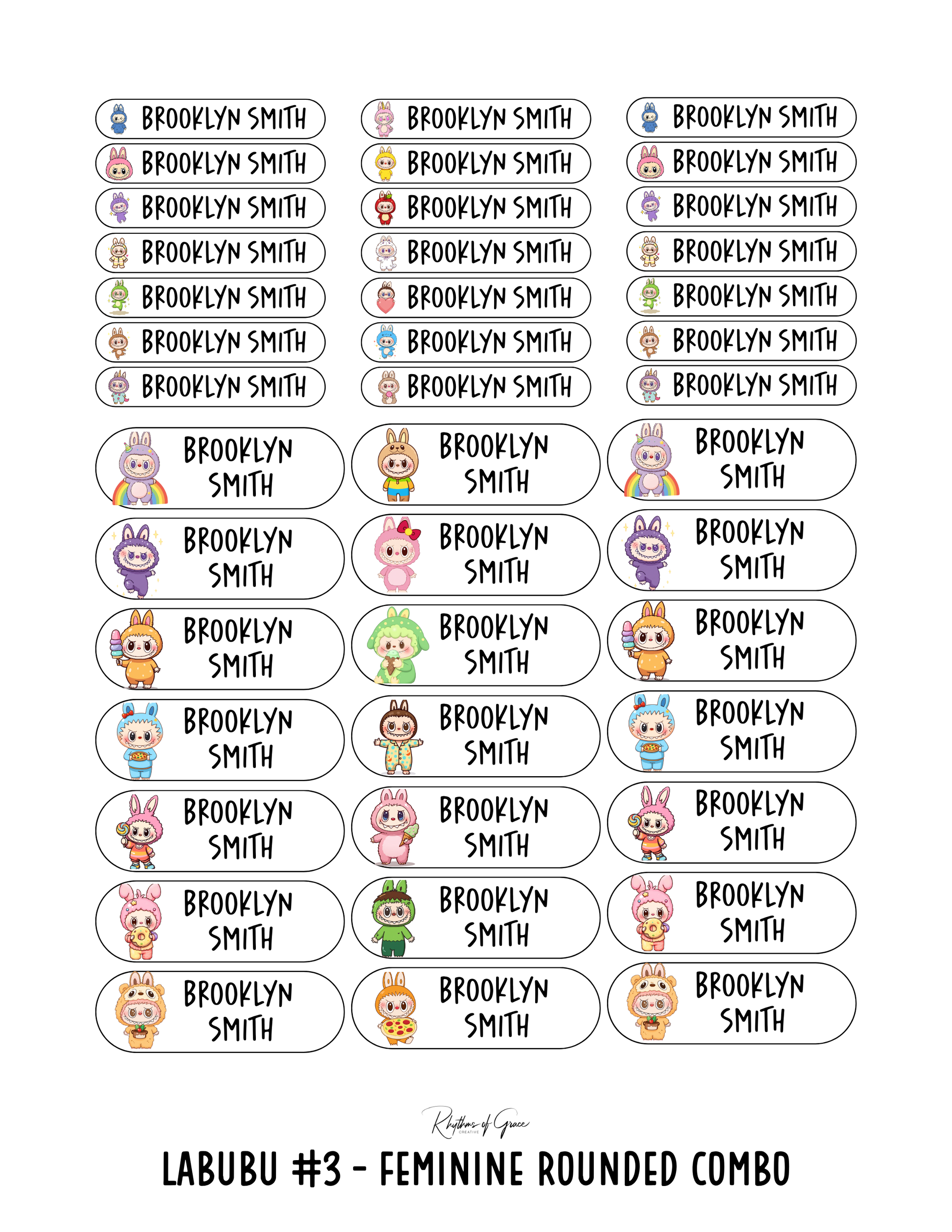 Labubu #3 (Feminine) / Rounded Edges / Small Combo: Includes 21 small rounded labels (2.1" x .4") and 21 medium rounded labels (2.2" x .7") - 1 sheet
