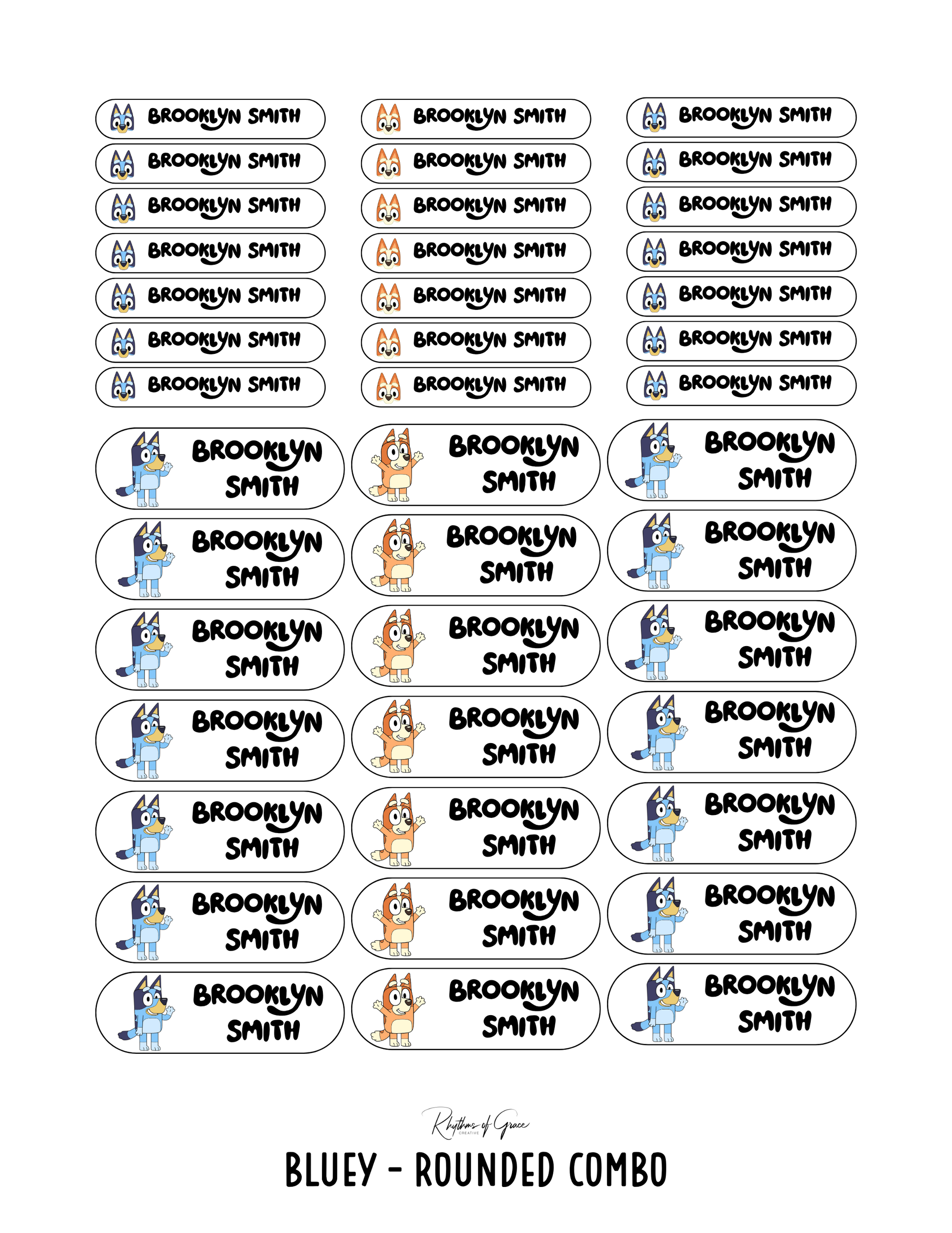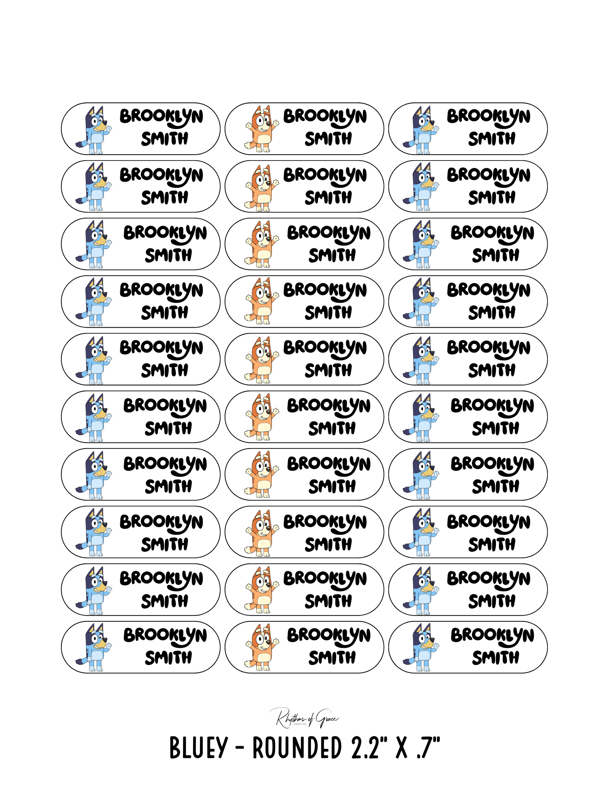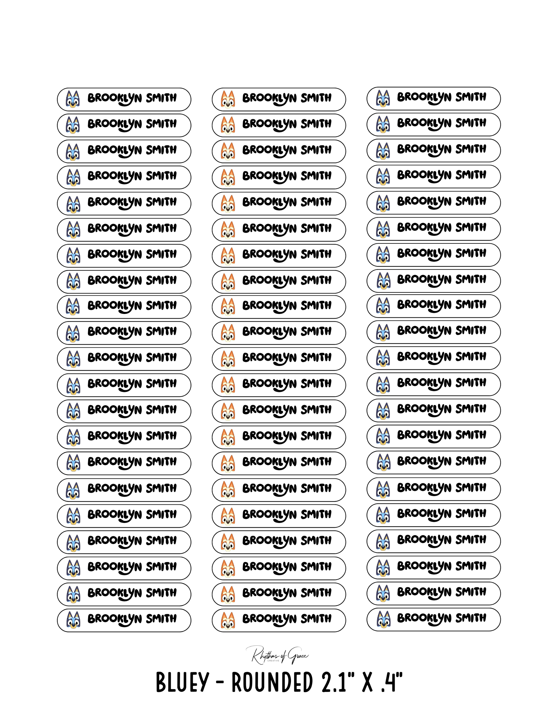 Bluey / Rounded Edges / Small Combo: Includes 21 small rounded labels (2.1" x .4") and 21 medium rounded labels (2.2" x .7") - 1 sheet