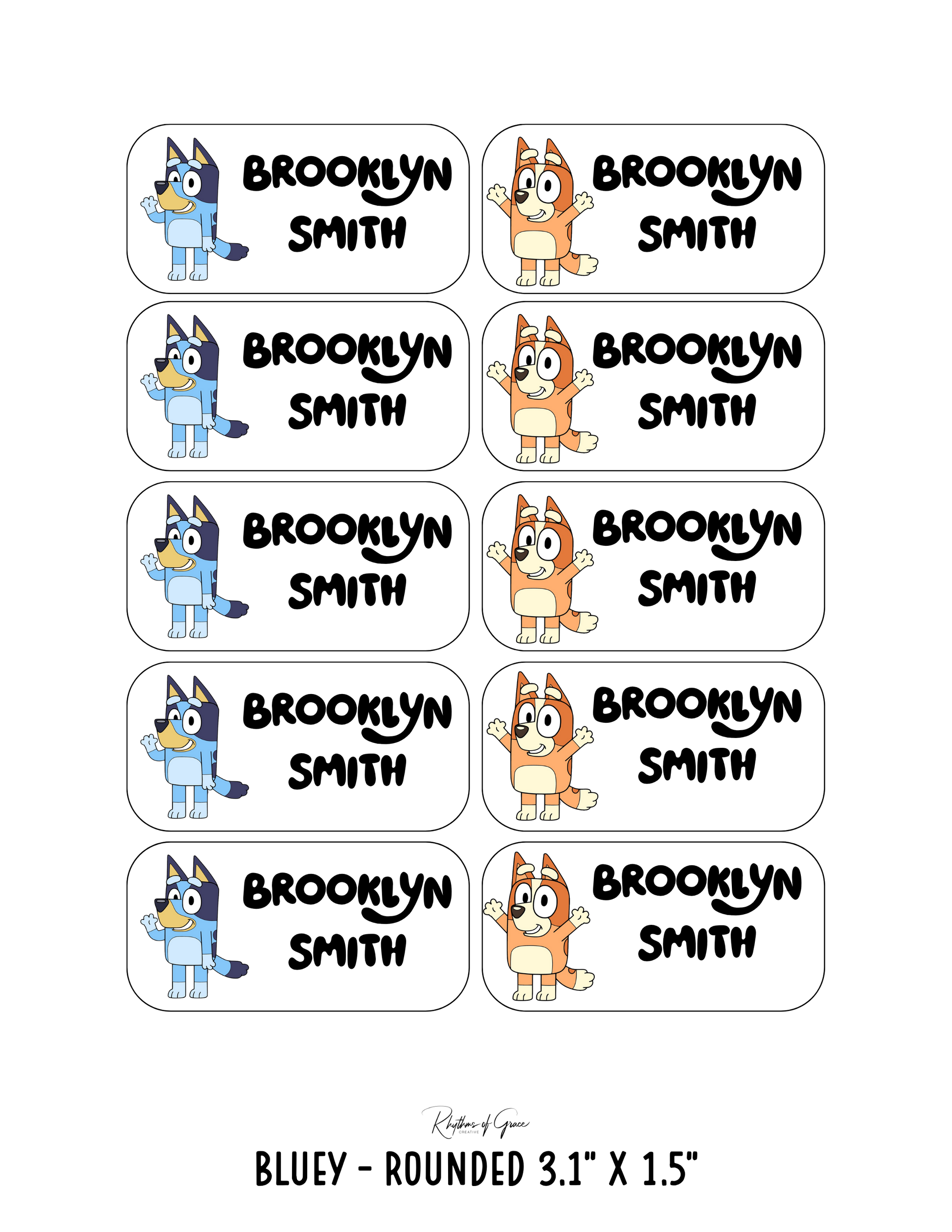 Bluey / Rounded Edges / Large: Includes 10 large rounded labels (3.1" x 1.5") - 1 sheet