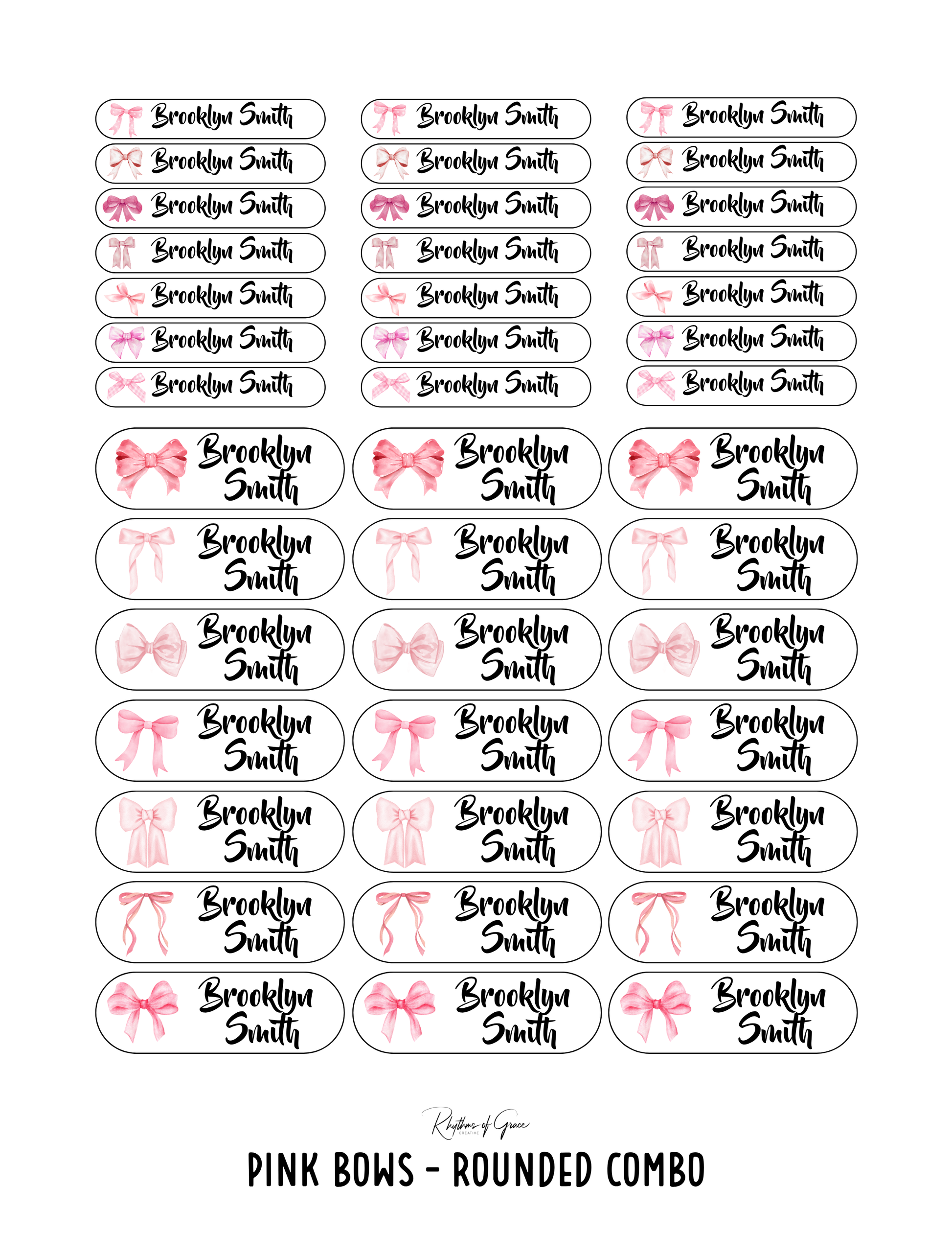 Pink Bows / Rounded Edges / Large Combo: Includes 62 small labels - 30 med labels - 10 large labels (3 sheets)