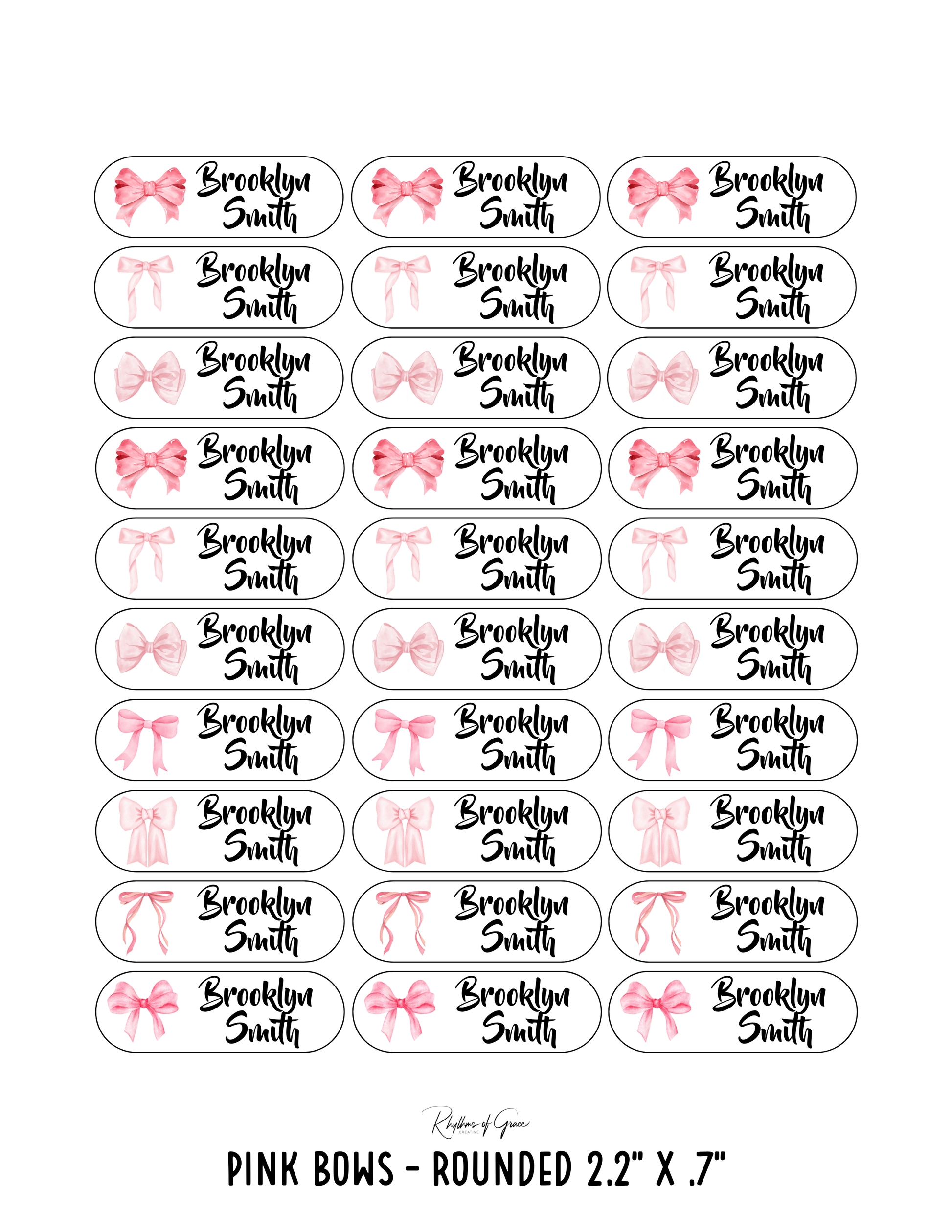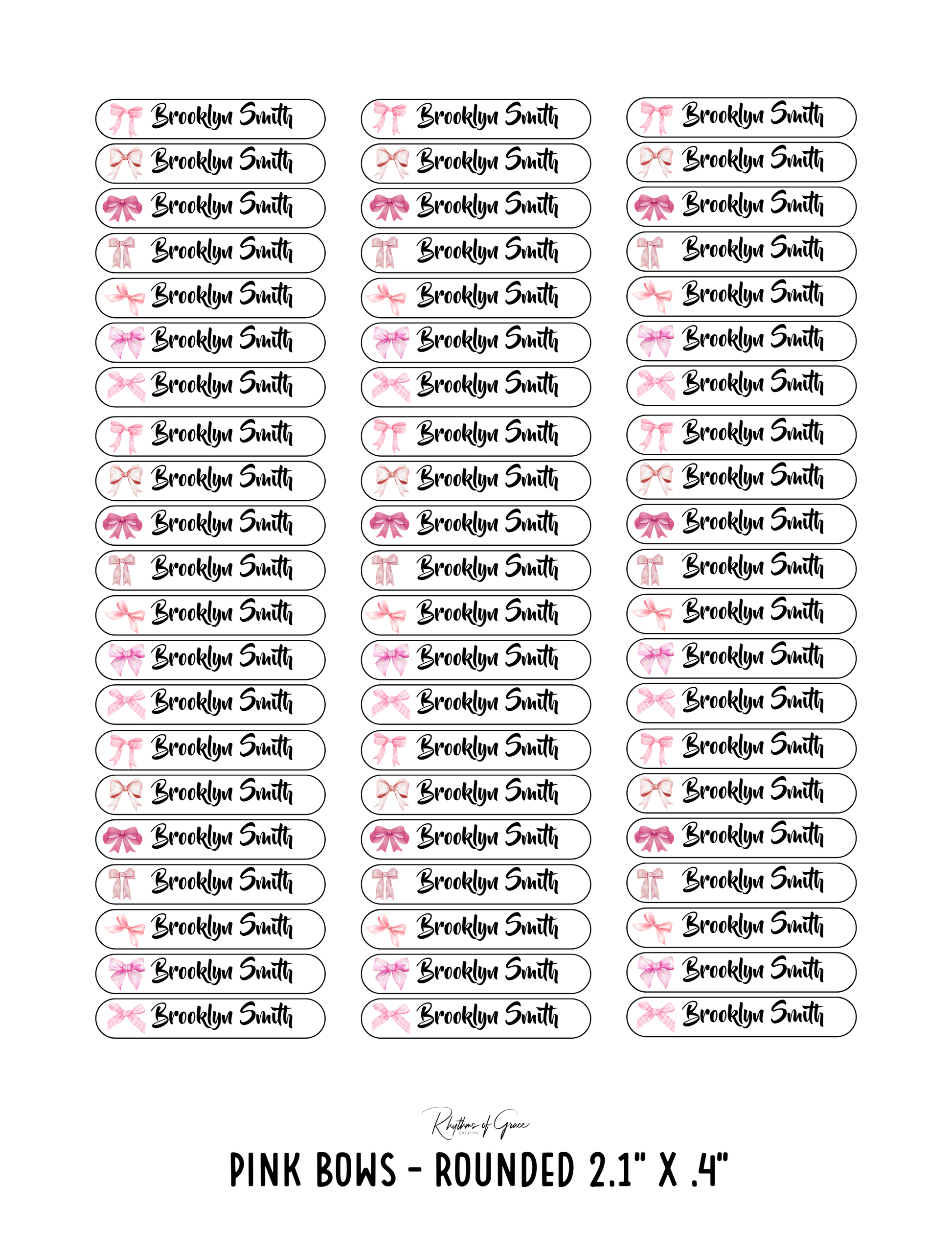Pink Bows / Rounded Edges / Small Combo: Includes 21 small rounded labels (2.1" x .4") and 21 medium rounded labels (2.2" x .7") - 1 sheet