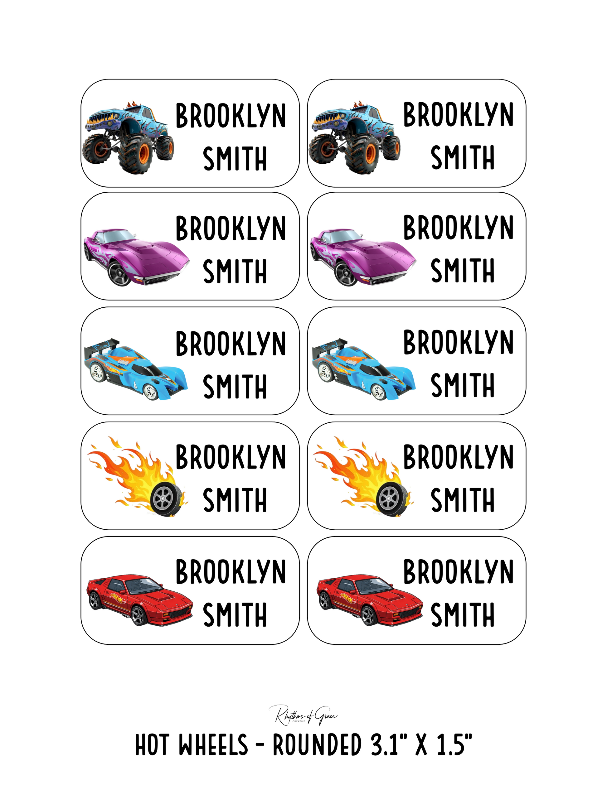 Hot Wheels / Rounded Edges / Large: Includes 10 large rounded labels (3.1" x 1.5") - 1 sheet