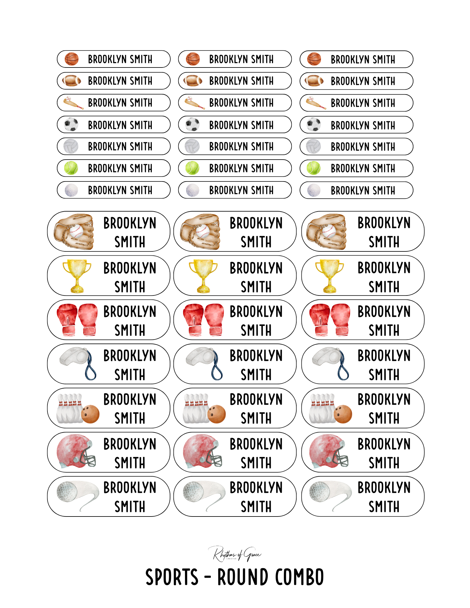 Sports / Rounded Edges / Small Combo: Includes 21 small rounded labels (2.1" x .4") and 21 medium rounded labels (2.2" x .7") - 1 sheet