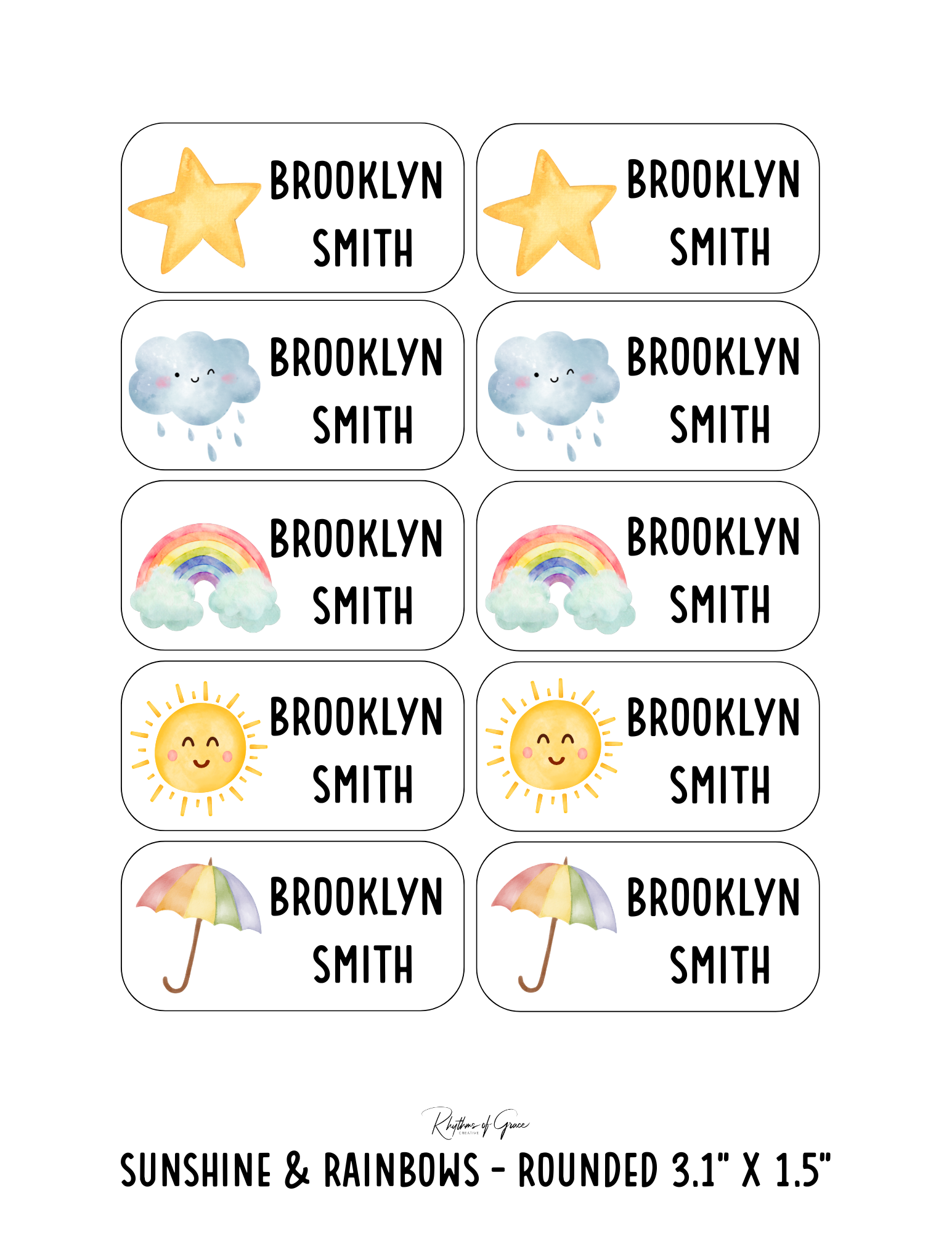 Sunshine & Rainbows / Rounded Edges / Large: Includes 10 large rounded labels (3.1" x 1.5") - 1 sheet