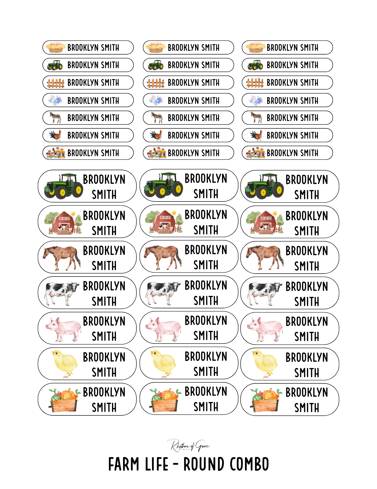 Farm Life / Rounded Edges / Small Combo: Includes 21 small rounded labels (2.1" x .4") and 21 medium rounded labels (2.2" x .7") - 1 sheet