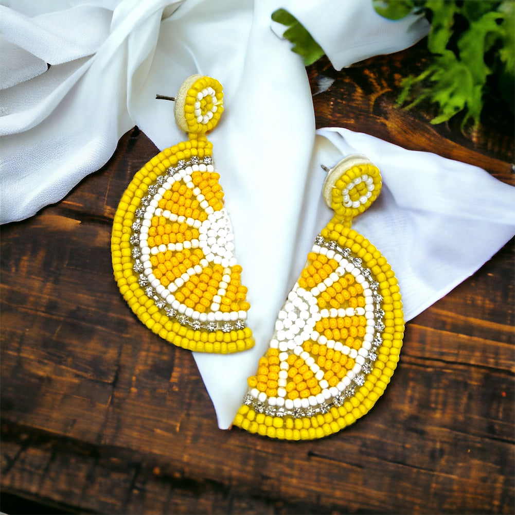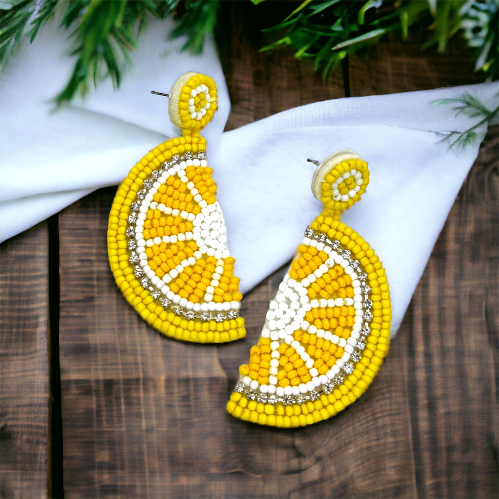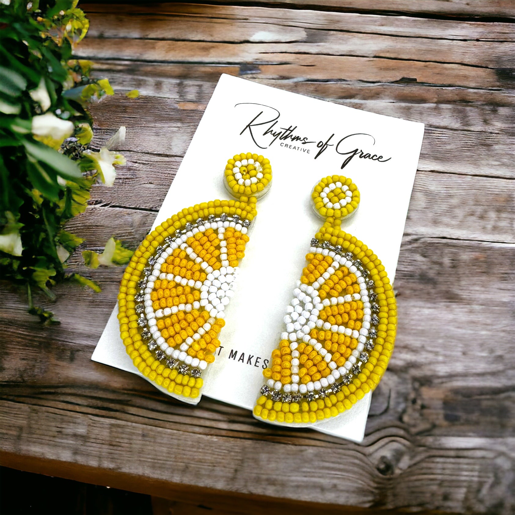 Beaded Lemon Earrings - Fruit Earrings, Handmade Jewelry, Lemon Jewelry, Food Earrings, Lemonade