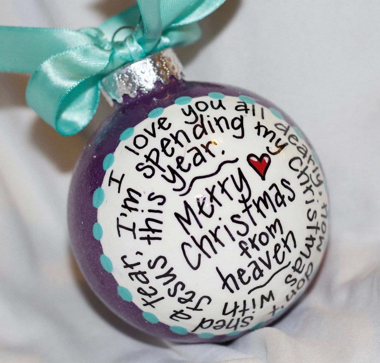 Ornament: “I love you all dearly, now don’t shed a tear, I’m spending my Christmas with Jesus this year. Merry Christmas from heaven.”