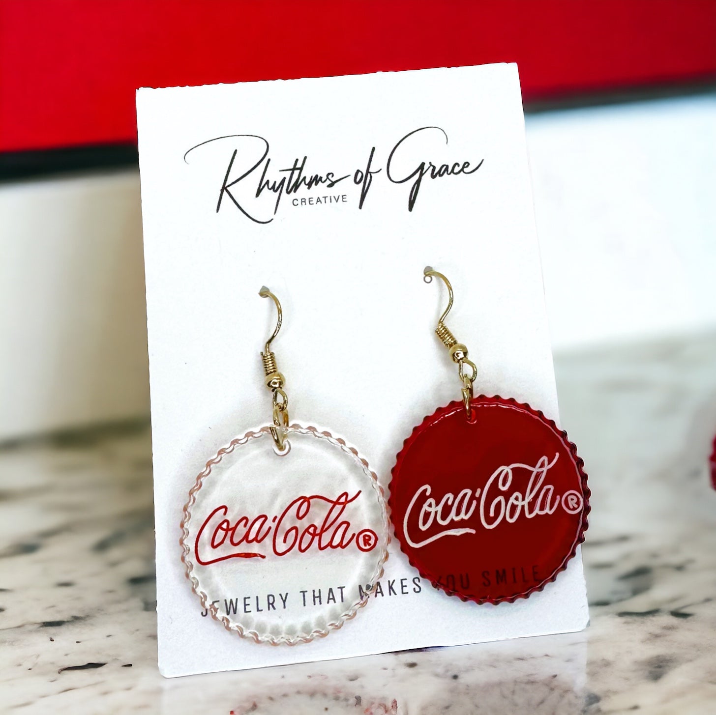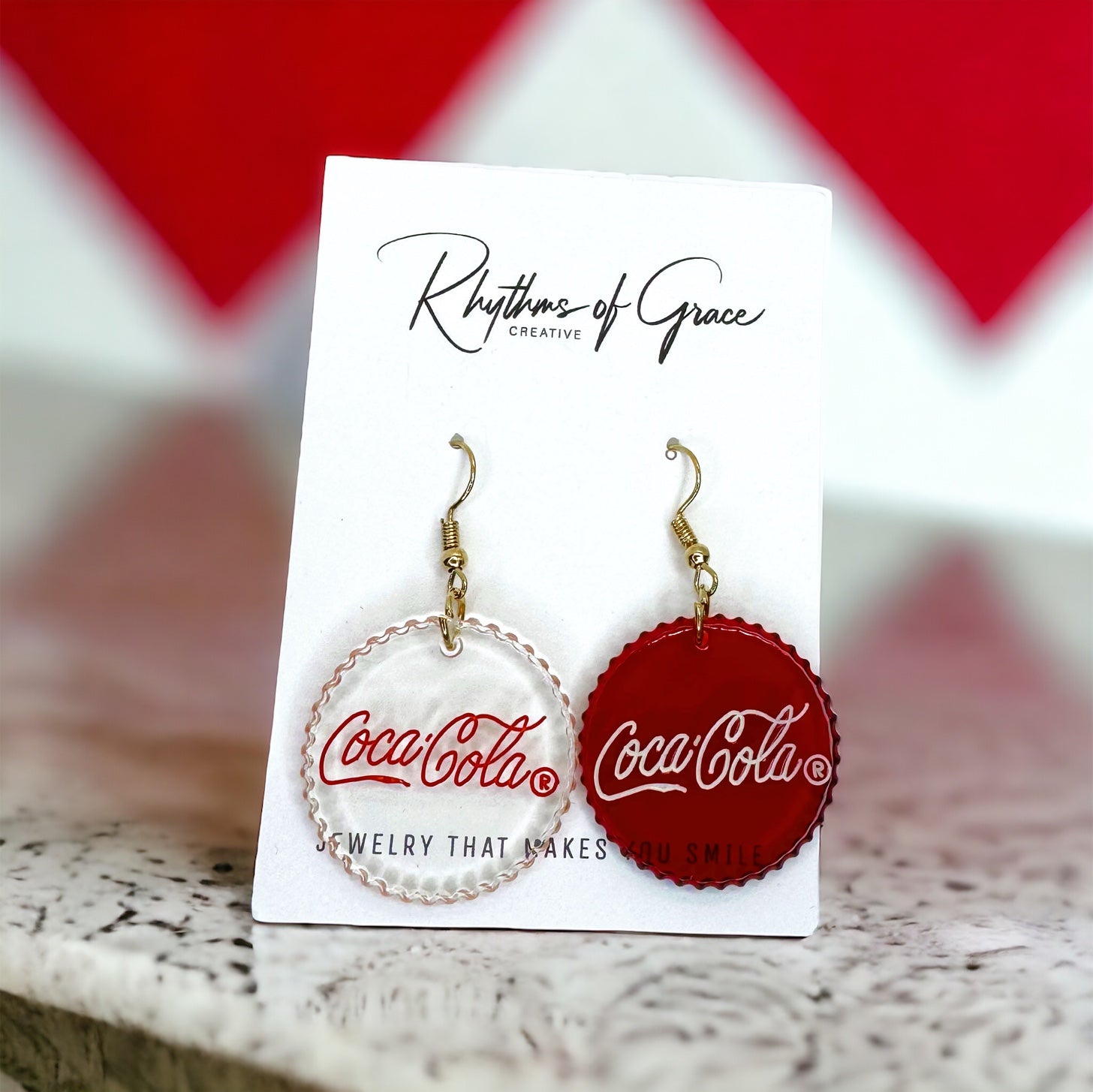Bottle Cap Earrings - Handmade Earrings, Red and White, Funny Earrings, Soda Bottle, Soda Bottle Cap