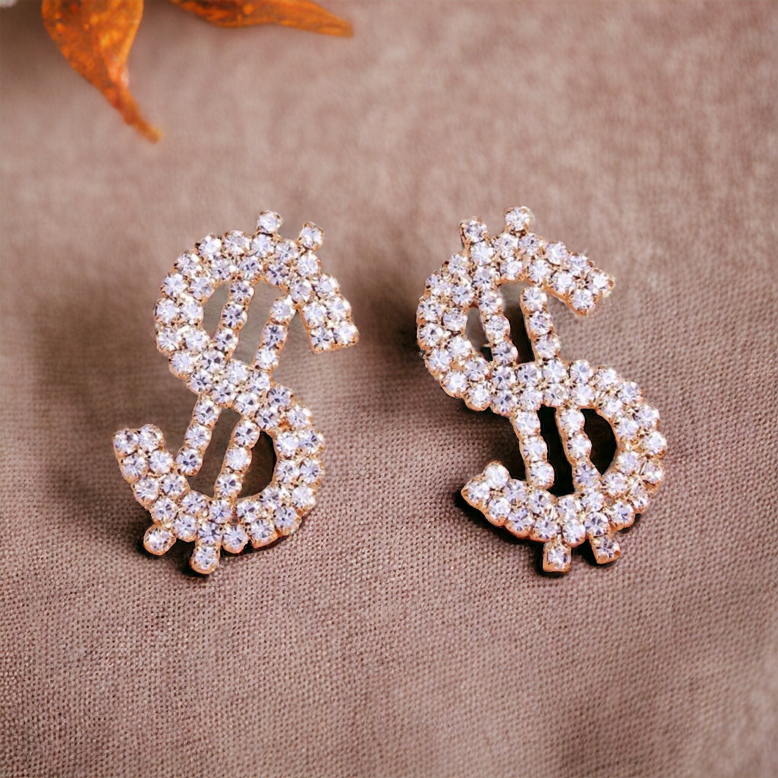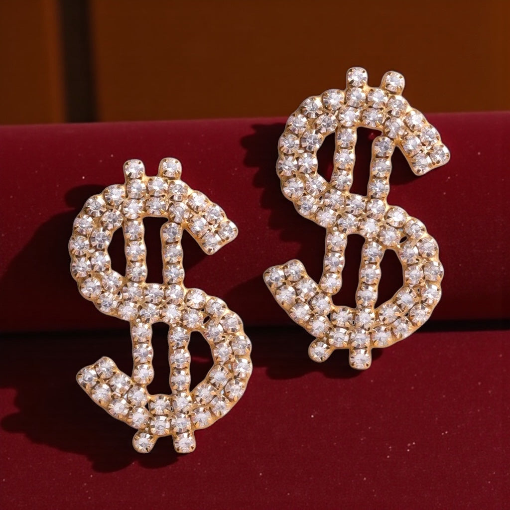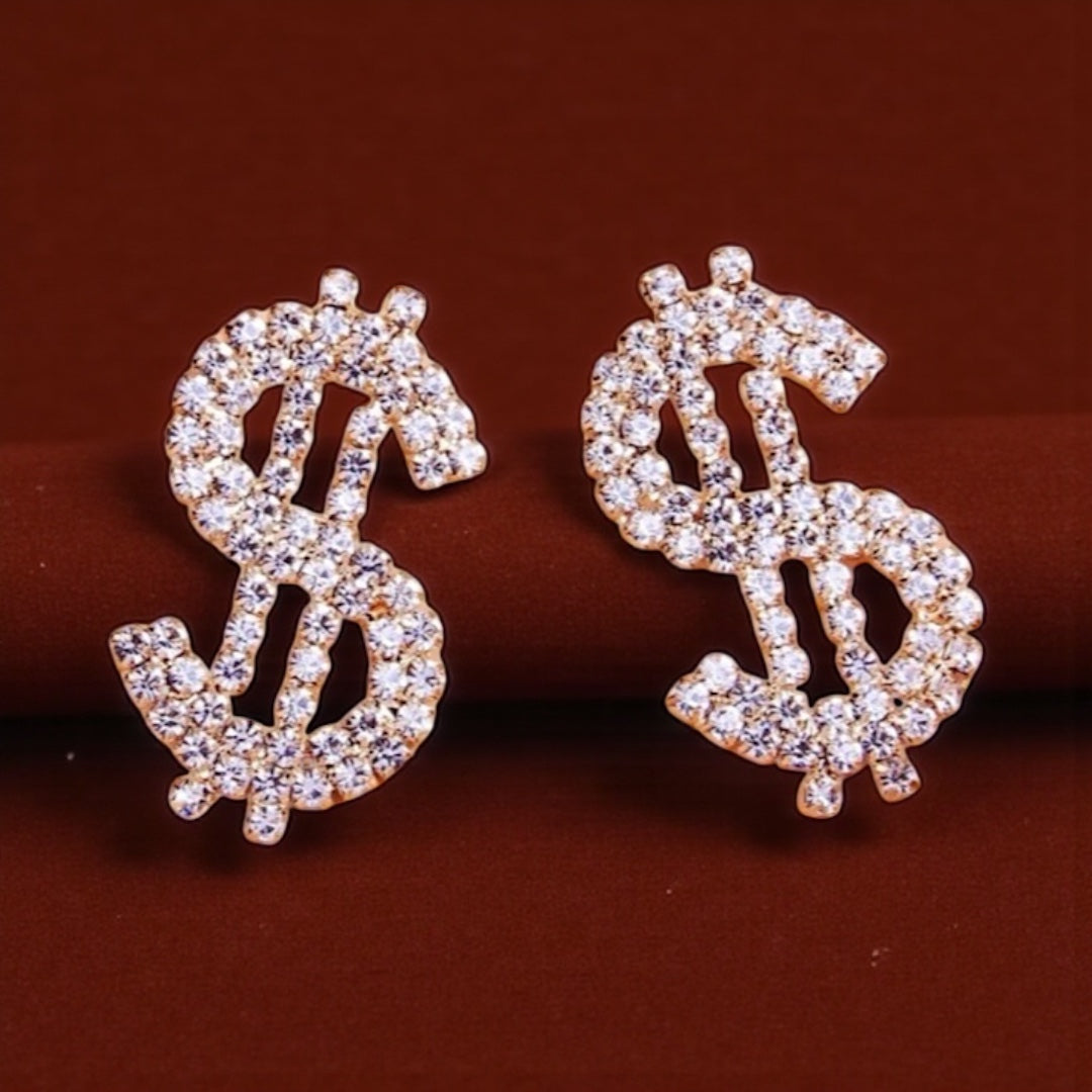 Sparkling Dollar Sign Shaped Earrings - 1.4 x 1 inches, Money