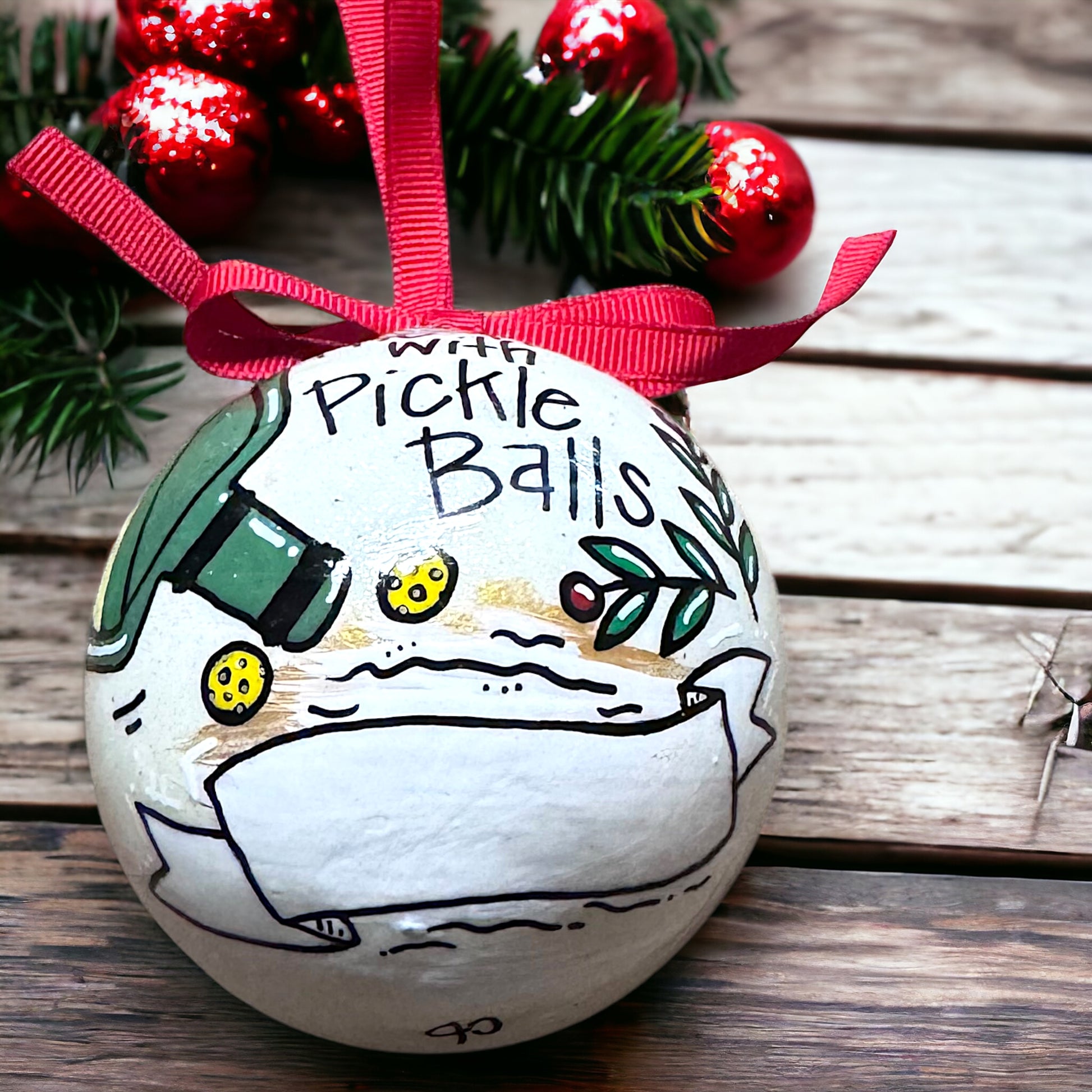 Add a little sporty charm to your Christmas tree with this hand-painted "Deck the Halls with Pickle Balls" ornament. Perfect for anyone who lives for the dink, lob, and smash!