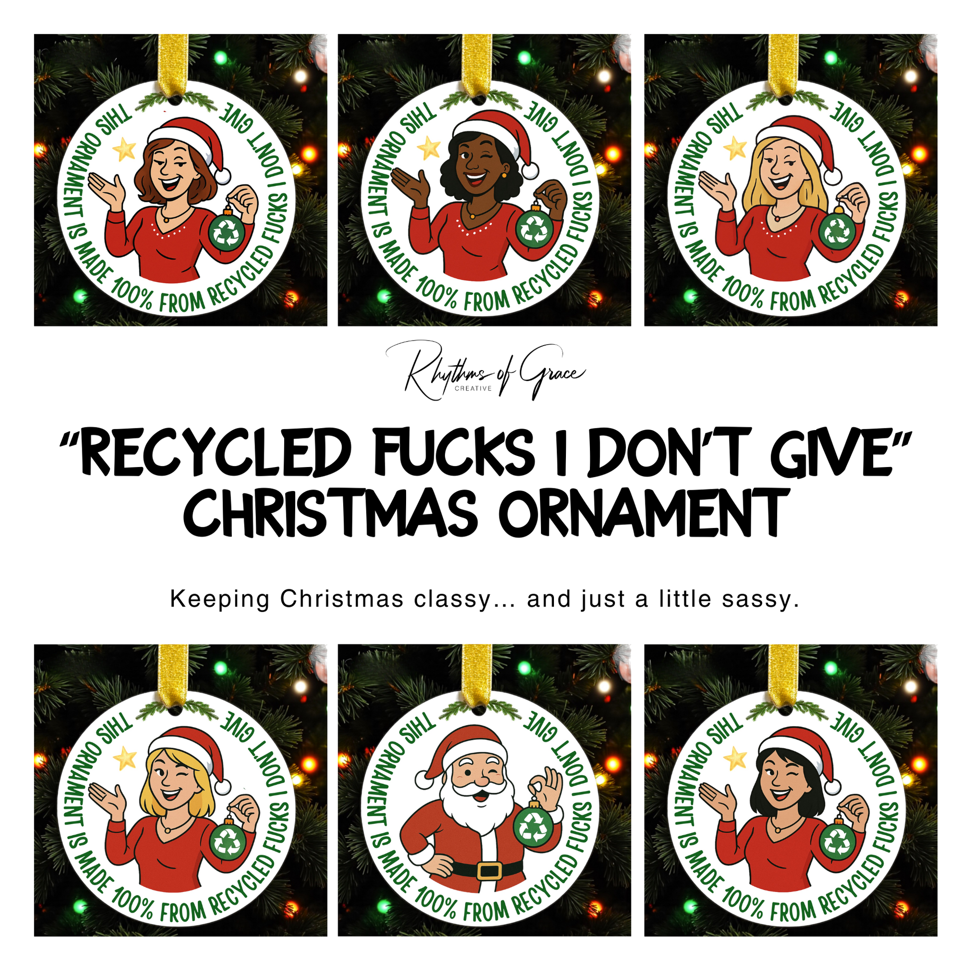 🎄 Funny Christmas Ornament – “Recycled Fucks I Don’t Give” | Adult Humor Holiday Gift | Personalized Sublimated Ornament | 6 Character Styles