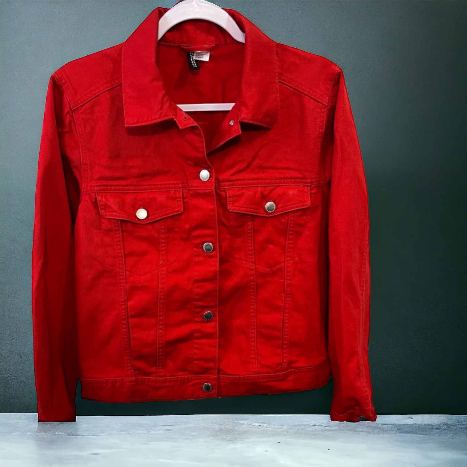Add a touch of festive rebellion to your wardrobe with our hand-painted red denim jacket. Featuring the cheeky phrase "Little Miss Good at Being Naughty," this size-medium jacket is the perfect Christmas statement piece. Sparkling glittery Christmas lights along the shoulders add an extra dose of holiday charm.