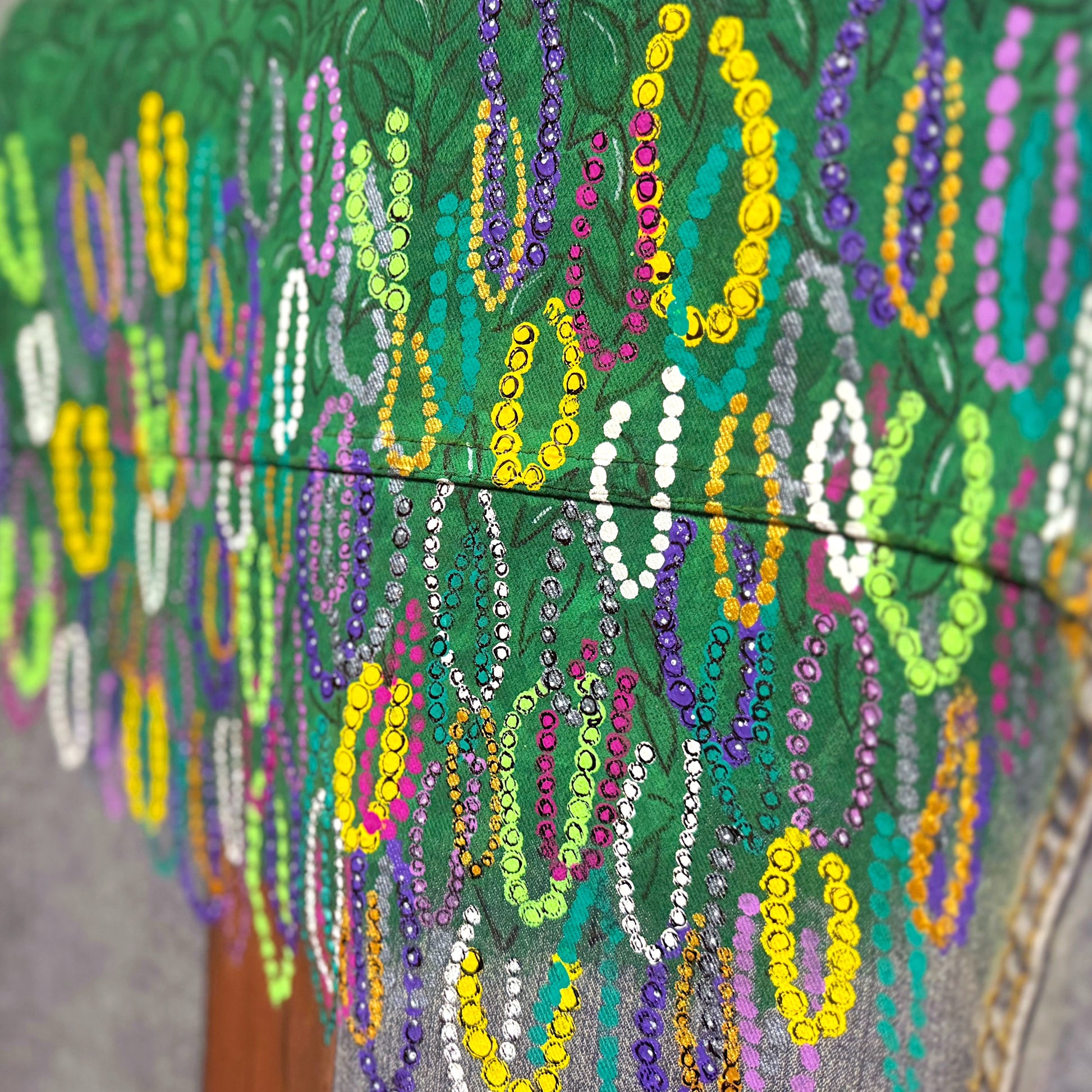 - Design: Beautiful hand-painted Mardi Gras bead tree design on the back