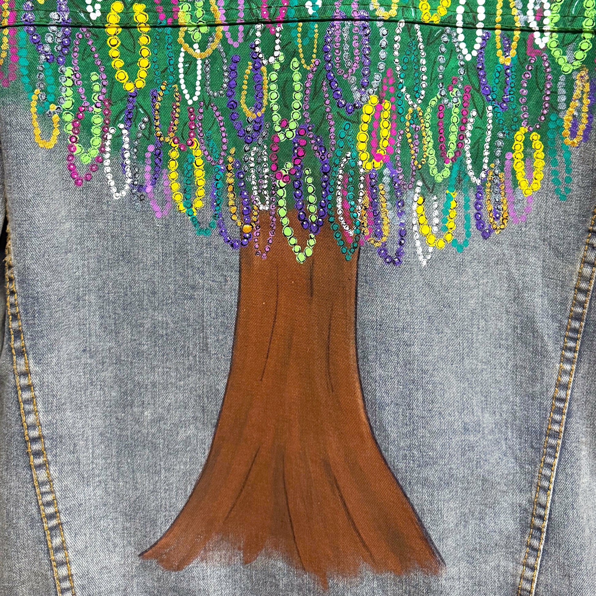 Hand Painted Jean Jacket: “Mardi Gras Bead Tree”