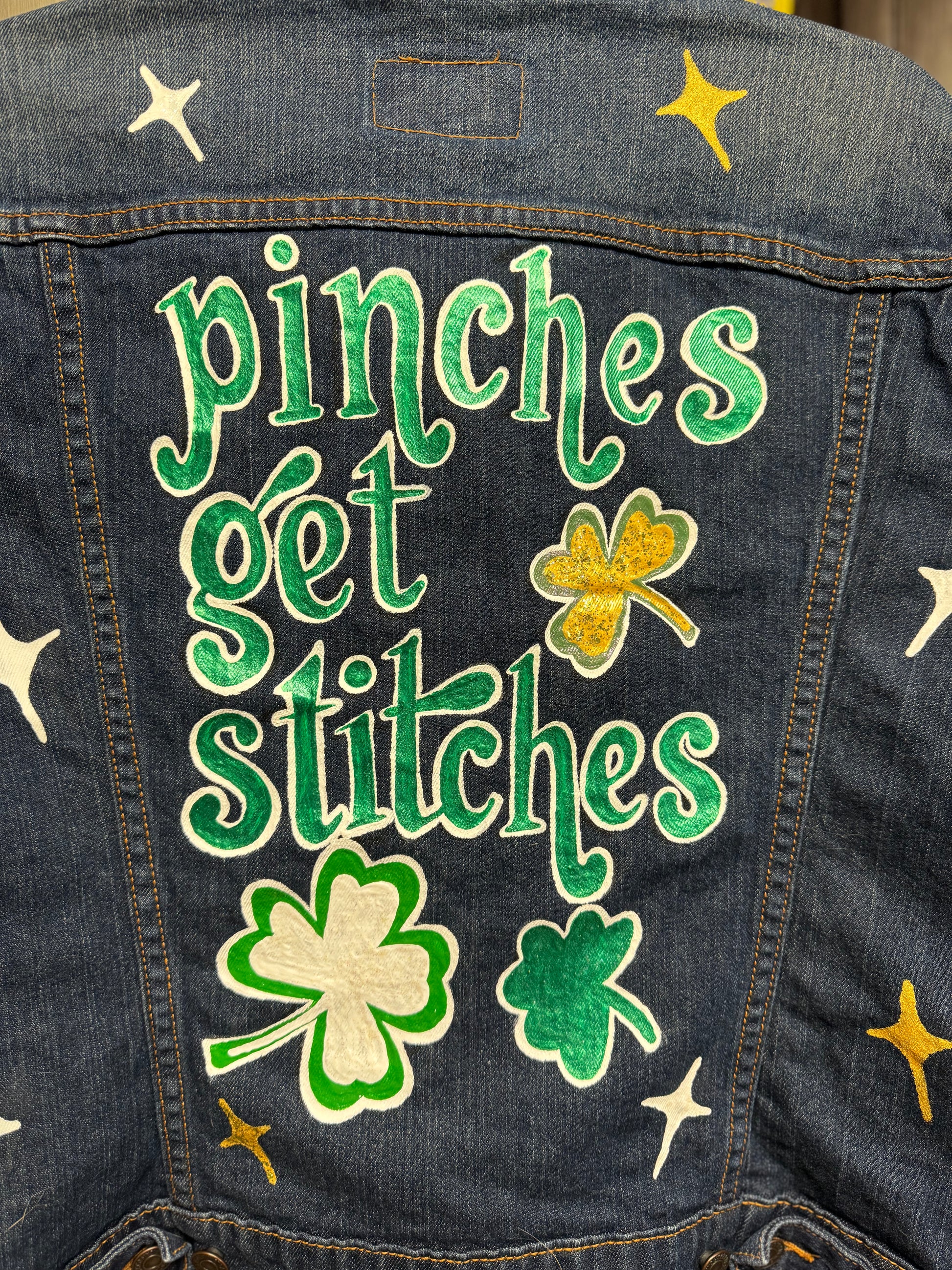 Hand Painted Jean Jacket: “Pinches Get Stitches”, St Patrick’s Day Jacket, Hand Painted, Shamrock