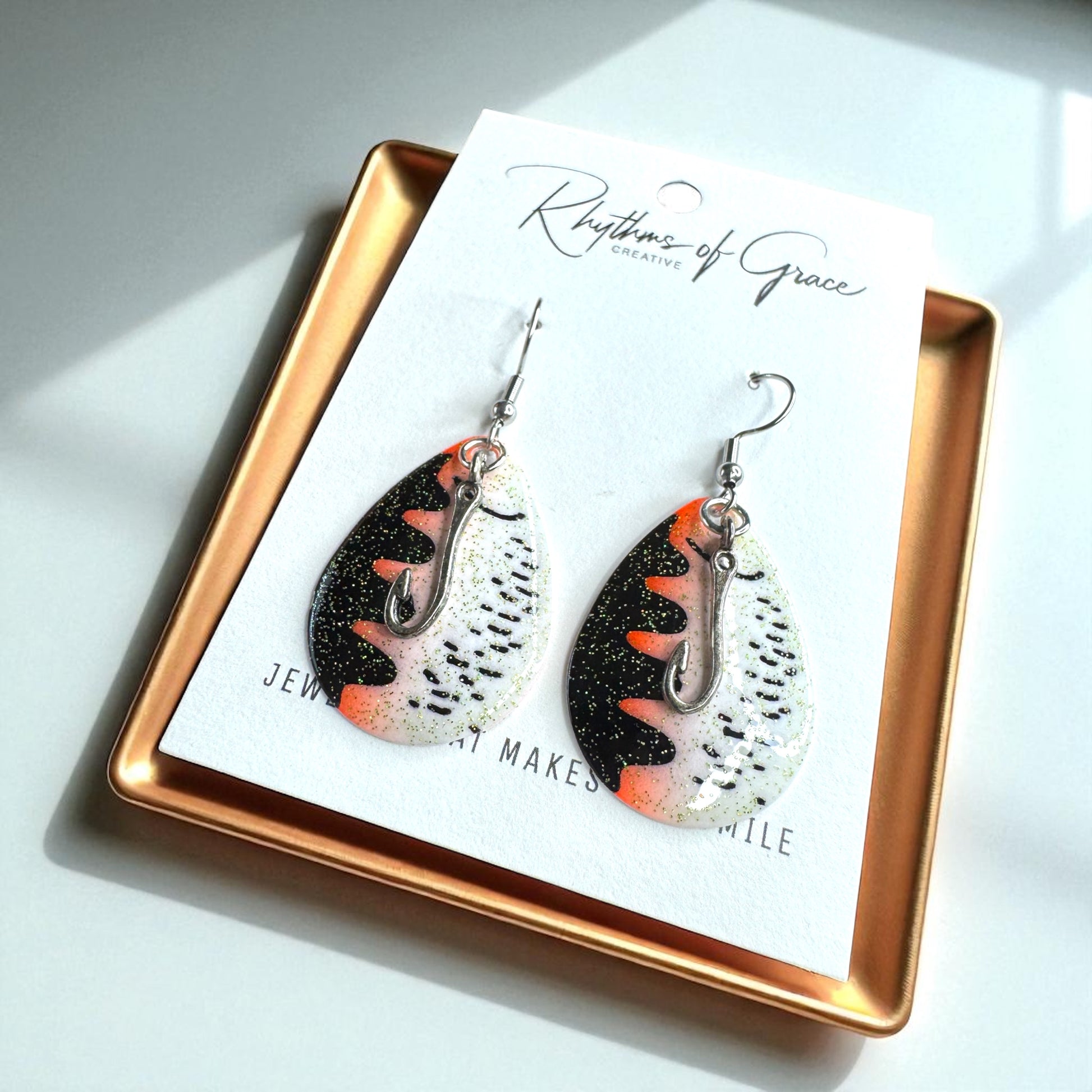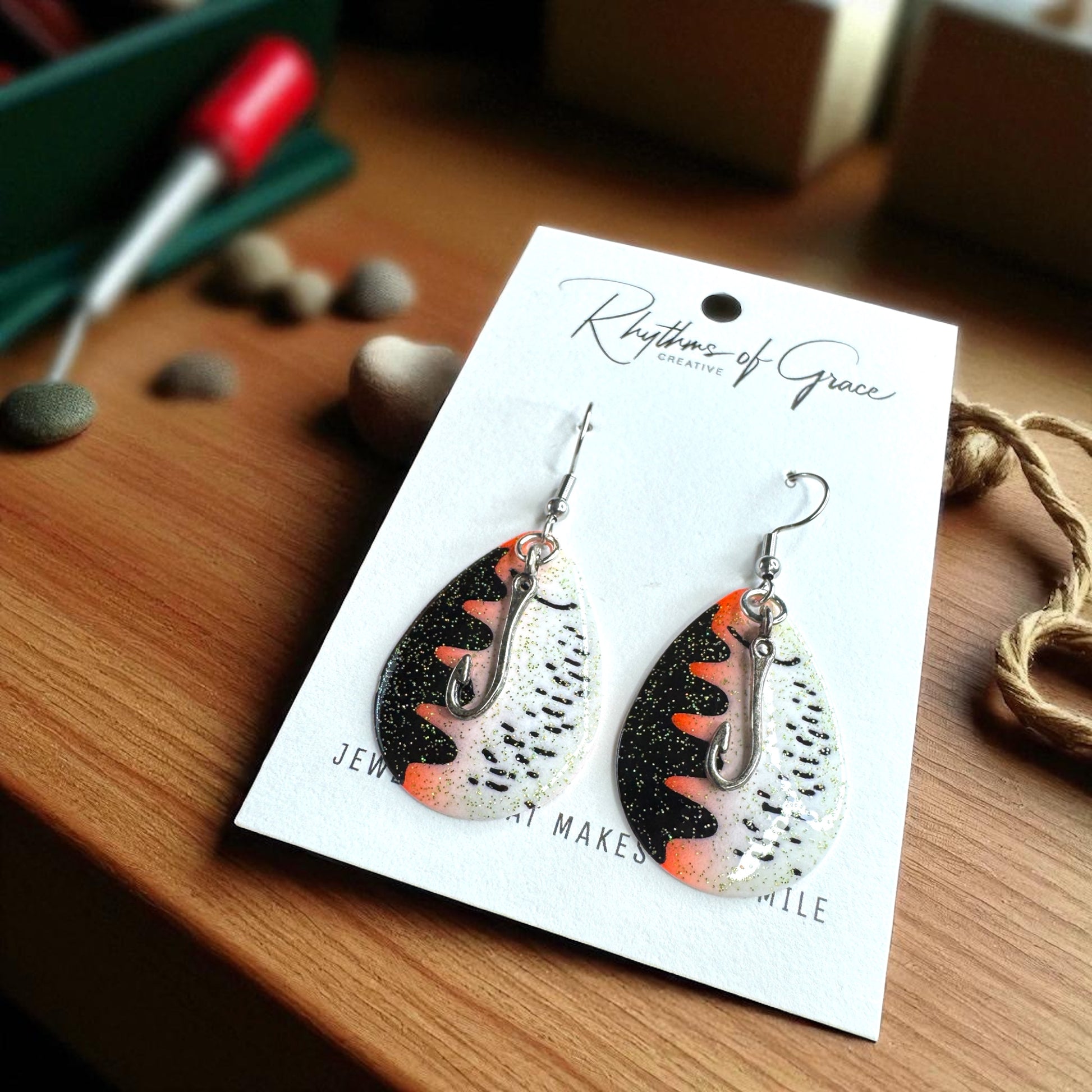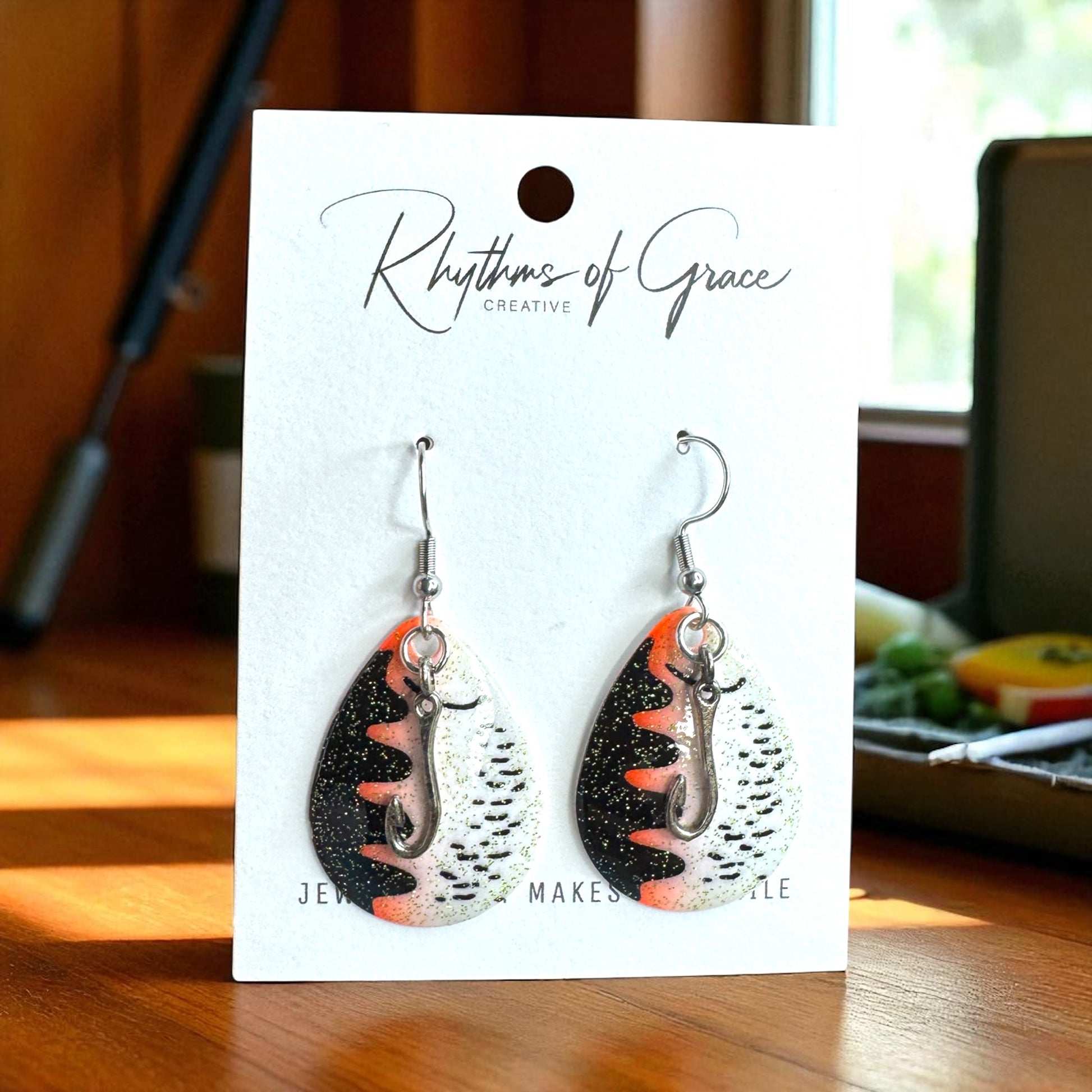 Reel in the compliments with these bold and playful Fishing Lure Dangle Earrings! Whether you’re a lake lover, a fishing fanatic, or just love to make a statement, these teardrop beauties are a total catch. Featuring a glittery black, white, and orange design with real hook-inspired charms, they’re perfect for your next outdoor adventure or girls' night out.