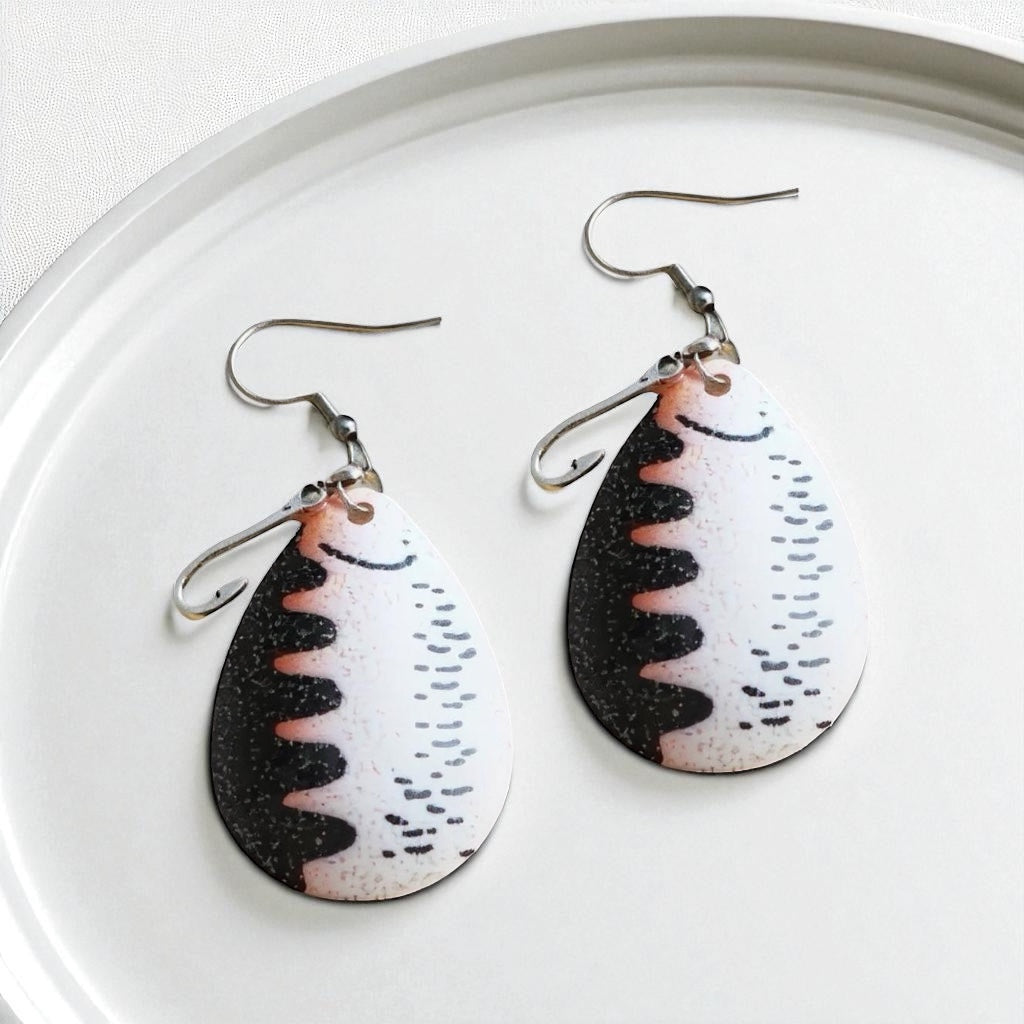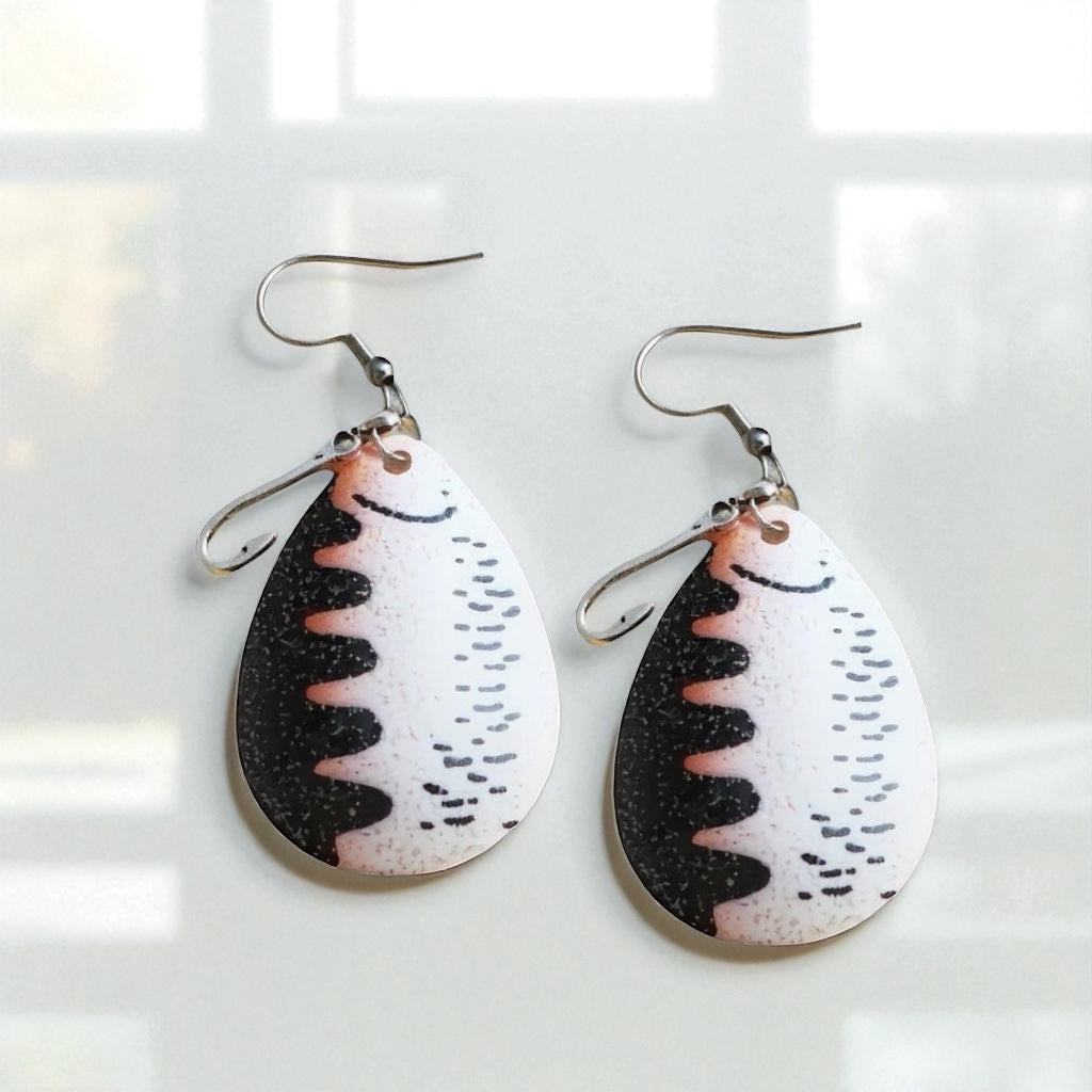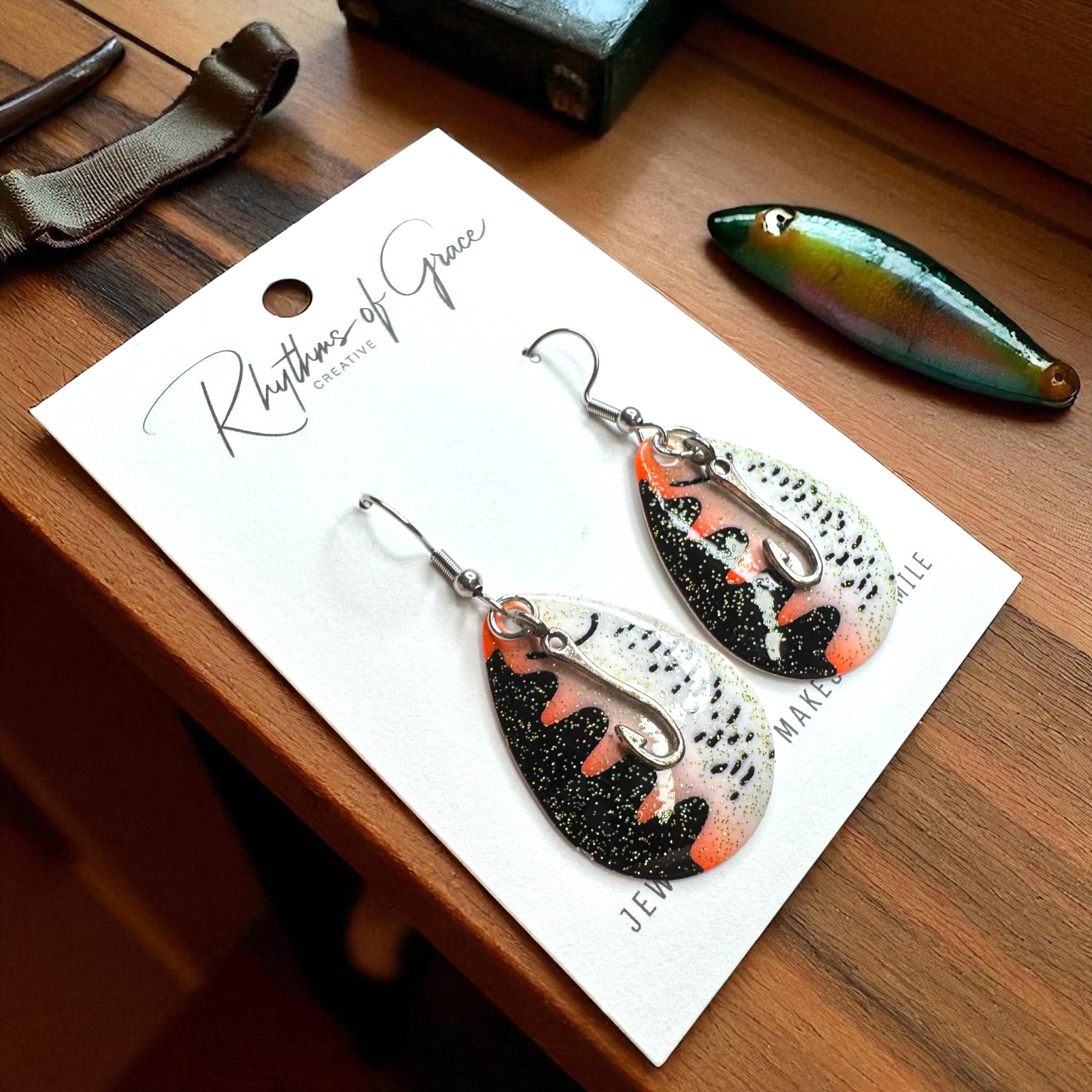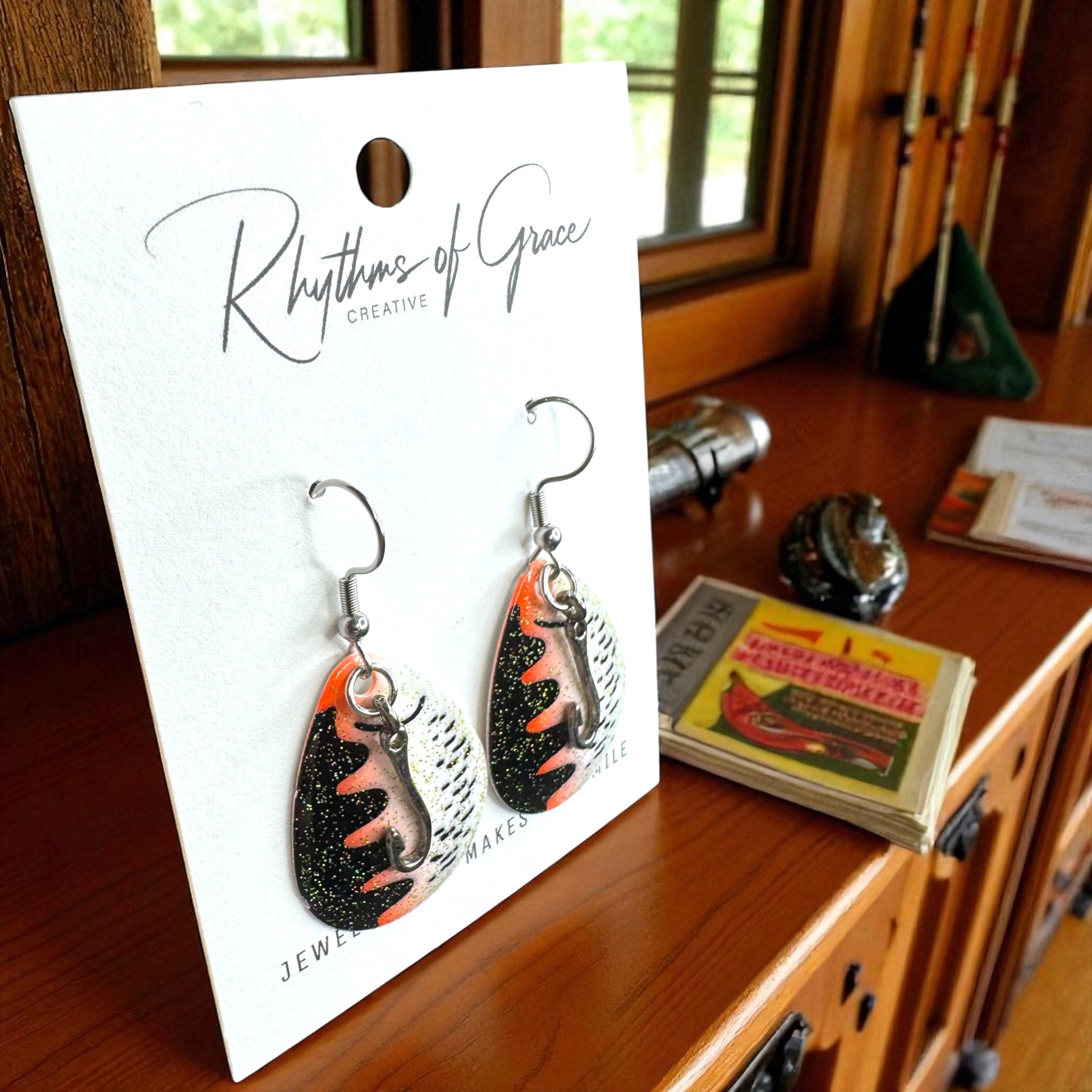 Reel in the compliments with these bold and playful Fishing Lure Dangle Earrings! Whether you’re a lake lover, a fishing fanatic, or just love to make a statement, these teardrop beauties are a total catch. Featuring a glittery black, white, and orange design with real hook-inspired charms, they’re perfect for your next outdoor adventure or girls' night out.