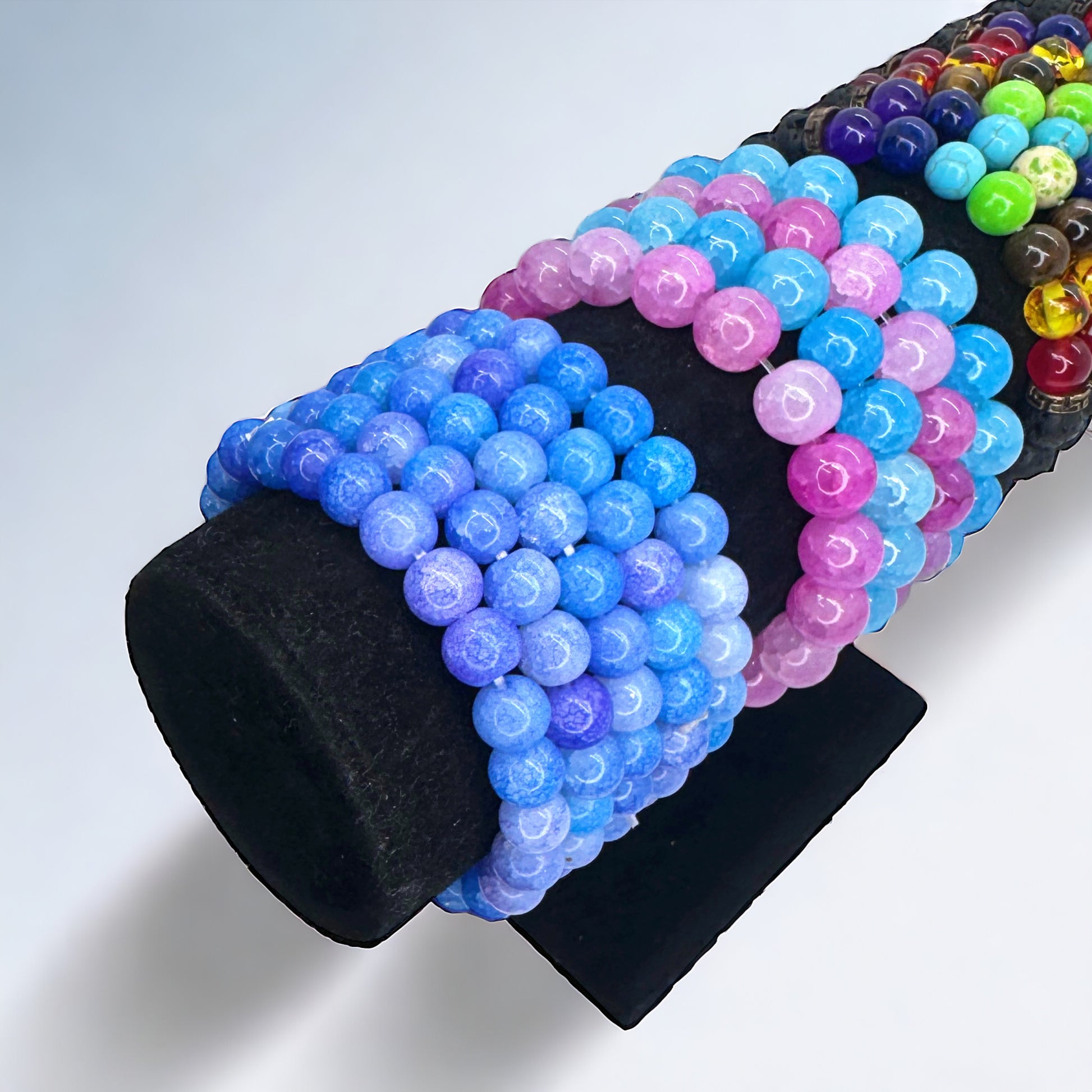Elevate your accessory game with our stunning Blue Glass Beaded Stretchy Bracelet. Crafted from beautifully weighted glass beads, this bracelet features a breathtaking blend of blue hues that catch the light with every movement.