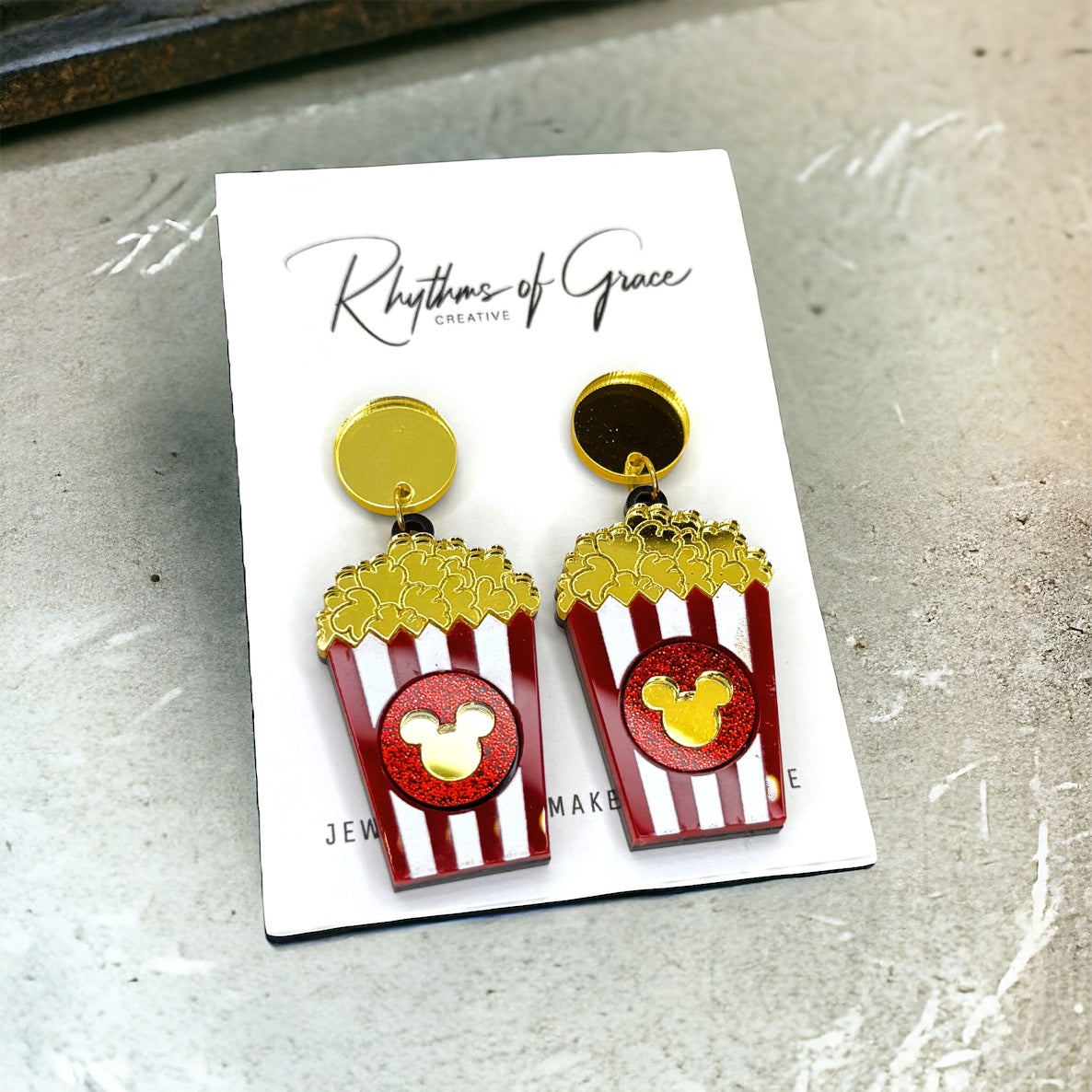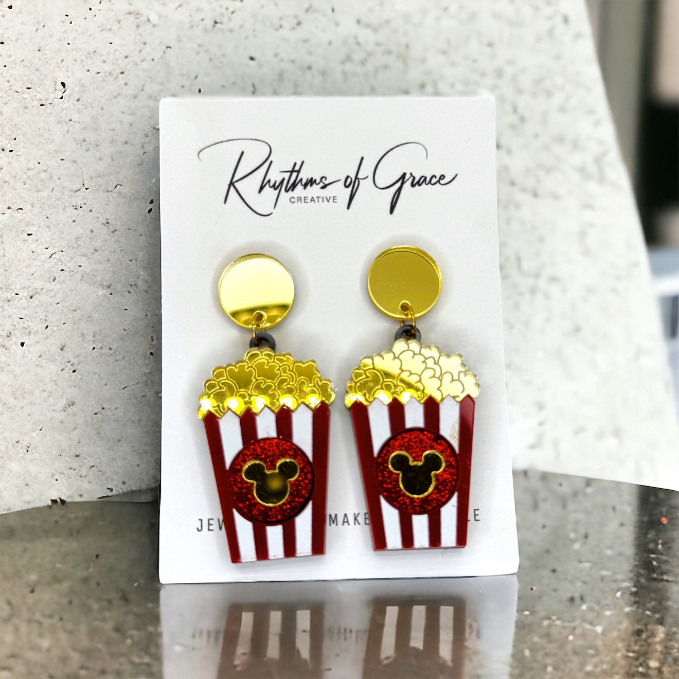 Add a pop of playful charm to your accessory collection with our delightful Popcorn Earrings! Perfectly designed as adorable popcorn buckets adorned with mouse ears, these earrings are a celebration of movie nights and theme park magic.