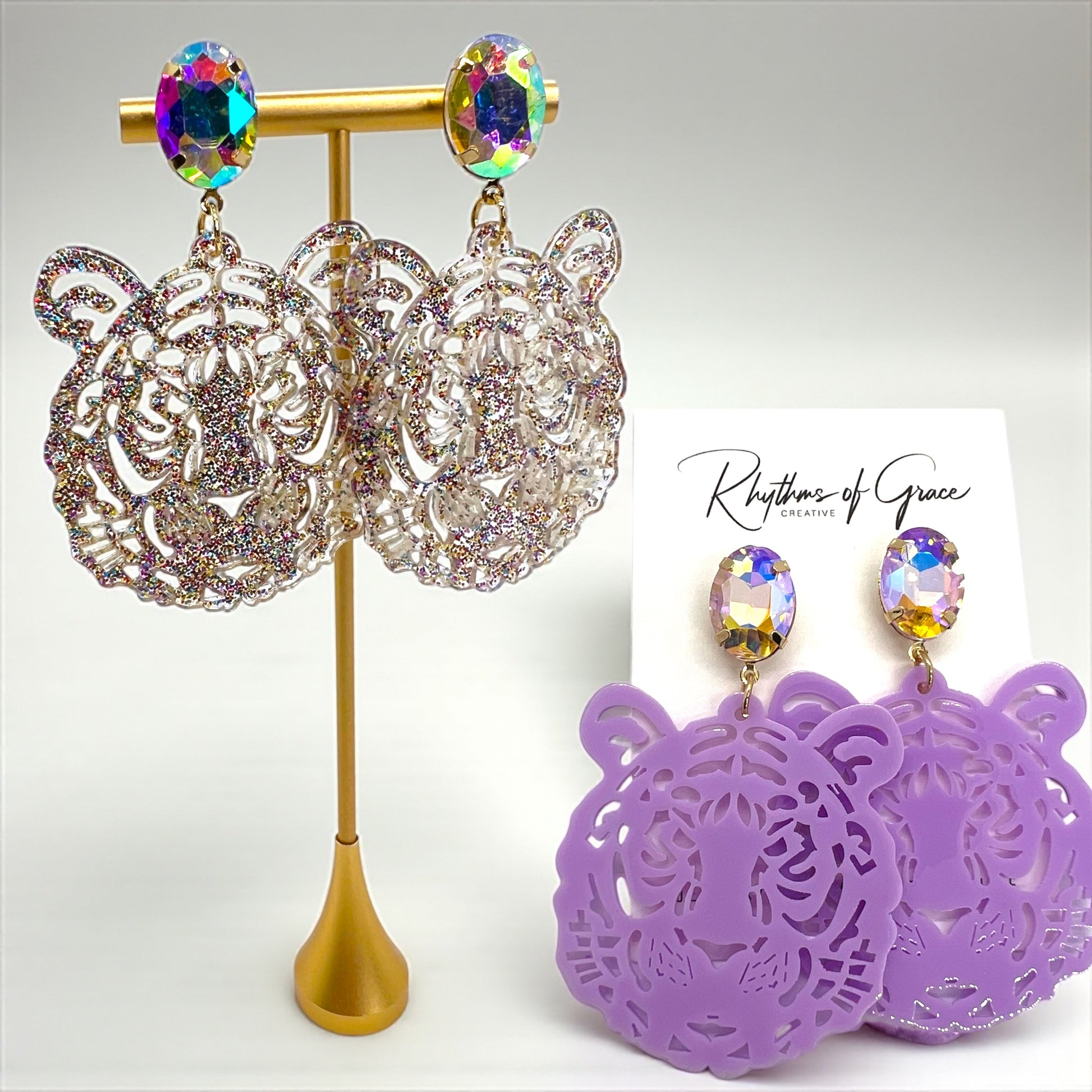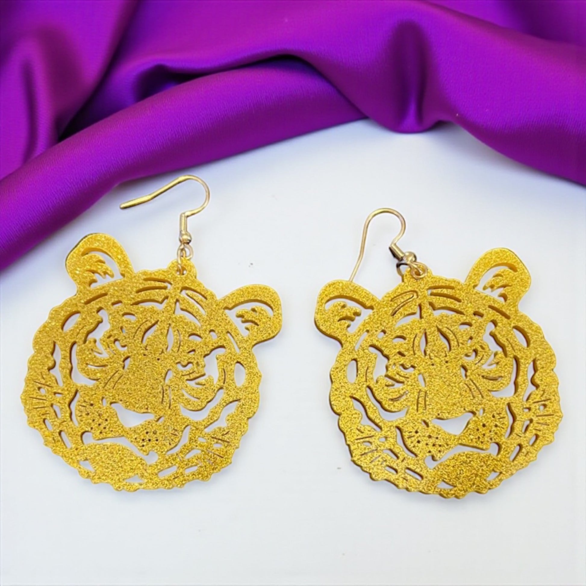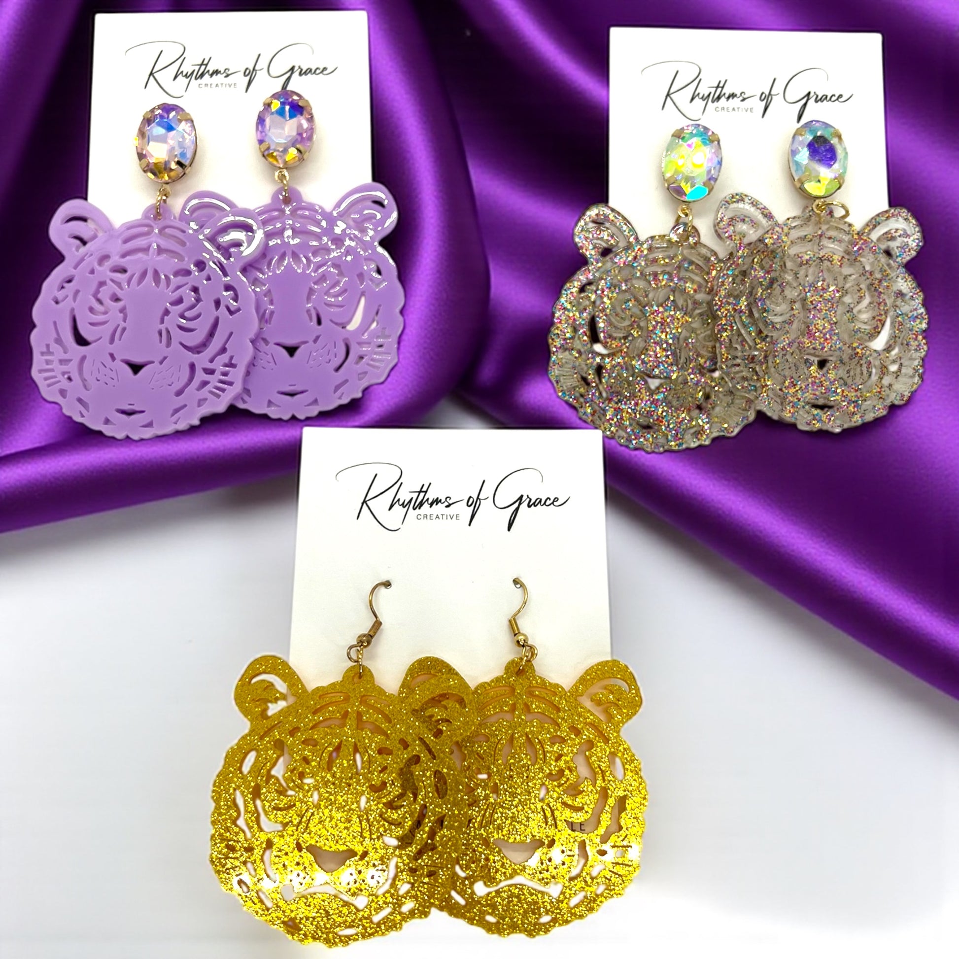 Available in three fierce styles – sparkling rhinestone tigers, bold purple acrylic tigers, and golden shimmer tigers – there’s a pair for every fan’s vibe. Whether you want to dazzle in glitter, keep it chic in purple, or roar in gold, these earrings will have you game-day ready.