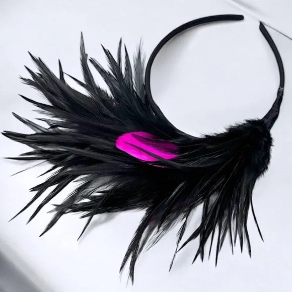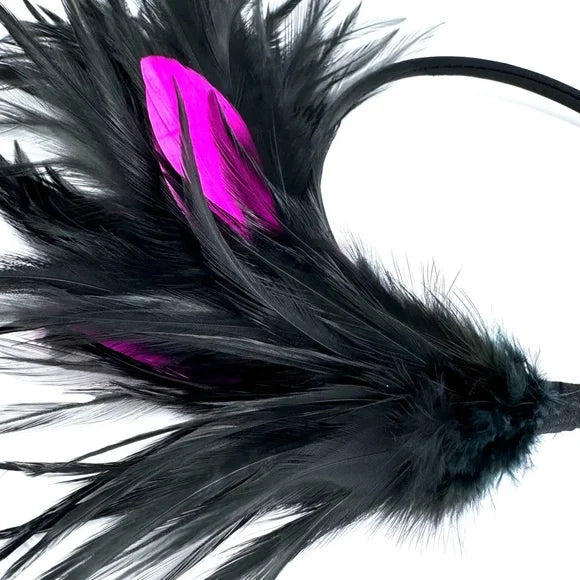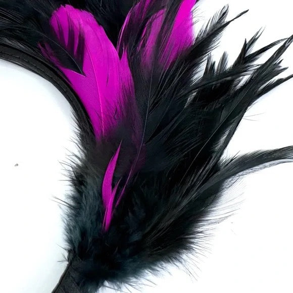 Elevate your costume or outfit with this fabulous pink and black feathered headband! Brand new and crafted with excellent quality, this headpiece is designed for comfort and style. With its nonslip grip, you can wear it all day without worry.