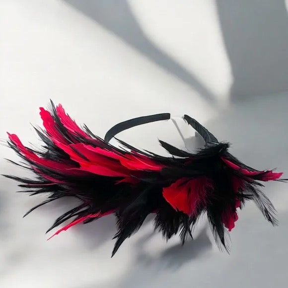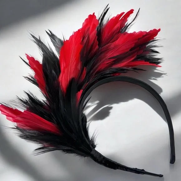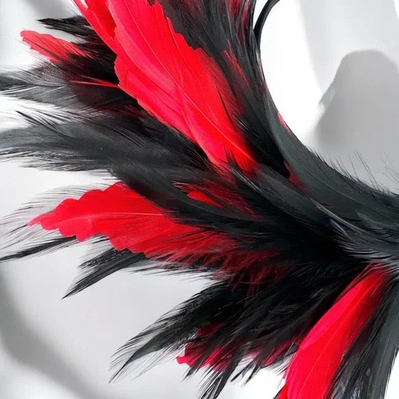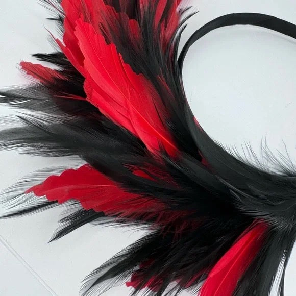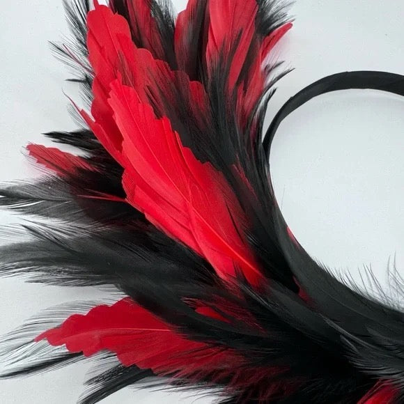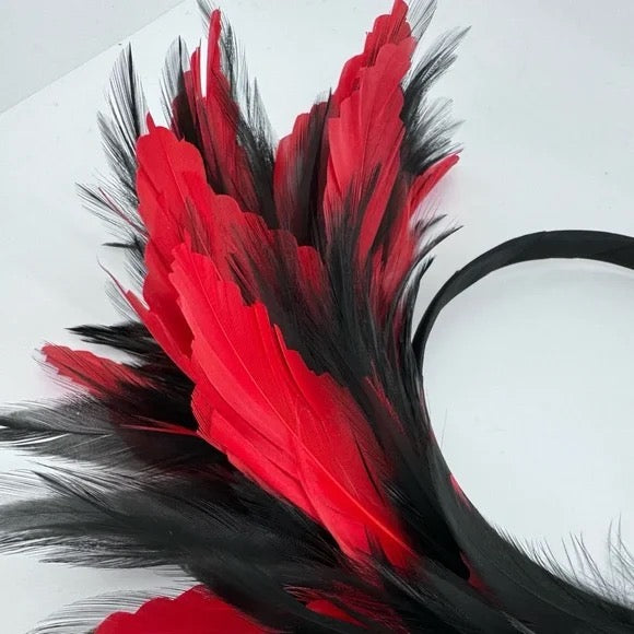 Elevate your costume or outfit with this fabulous red and black feathered headband! Brand new and crafted with excellent quality, this headpiece is designed for comfort and style. With its nonslip grip, you can wear it all day without worry.